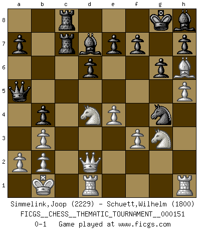 Last move : 0-1 2012 November 15 9:37:30 [Event "FICGS__CHESS__THEMATIC_TOURNAMENT__000151"] [Site "FICGS"] [Date "2012.08.12"] [Round "1"] [White "Simmelink,Joop"] [Black "Schuett,Wilhelm"] [Result "0-1"] [WhiteElo "2229"] [BlackElo "1800"] 1.e4 c5 2.Nf3 d6 3.d4 cxd4 4.Nxd4 Nf6 5.Nc3 g6 6.Be3 Bg7 7.f3 O-O 8.Qd2 Nc6 9.Bc4 Na5 10.Bb3 Bd7 11.O-O-O Nxb3+ 12.cxb3 Qa5 13.Kb1 Rfc8 14.g4 b5 15.h4 b4 16.Nce2 Rc7 17.Bh6 Bh8 18.h5 Rac8 19.Ng3 Nxg4 0-1 Sicilian : Dragon, Yugoslav attack, 7...O-O Kingside Castling by player Black (move 7) Queenside Castling by player White (move 11) Player Black won this chess game. Follow this game move after move (download)All I want to do, ever, is just play Chess. (Bobby Fischer) Ich habe die Schachforschung dermaßen betrieben, dass sie auf eine wissenschaftliche Basis gestellt wurde. (Mikhail Moiseyevich Botvinik) El Ajedrez no es una pizca de inferior al violín, y tenemos un gran número de violinistas profesionales. (Mikhail Botvinnik) A chaque perte on perd un peu de soi. (Joël Lautier) Hardware: the parts of a computer that can be kicked. (Jeff Persis)