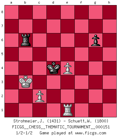 Last move : 1/2-1/2 2013 May 12 22:55:11 [Event "FICGS__CHESS__THEMATIC_TOURNAMENT__000151"] [Site "FICGS"] [Date "2012.08.12"] [Round "1"] [White "Strohmeier,Josef"] [Black "Schuett,Wilhelm"] [Result "1/2-1/2"] [WhiteElo "1431"] [BlackElo "1800"] 1.e4 c5 2.Nf3 d6 3.d4 cxd4 4.Nxd4 Nf6 5.Nc3 g6 6.Be3 Bg7 7.f3 O-O 8.Qd2 Nc6 9.Bc4 Bd7 10.O-O-O Qb8 11.g4 Ne5 12.Bb3 Rc8 13.h4 Nc4 14.Bxc4 Rxc4 15.h5 Qf8 16.hxg6 fxg6 17.Qh2 Rxc3 18.bxc3 Rc8 19.g5 Nh5 20.Qd2 Qd8 21.Nb3 Qc7 22.Bd4 e5 23.Be3 Qxc3 24.Qxc3 Rxc3 25.Rxd6 Rxe3 26.Rxd7 Rxf3 27.Rxb7 Rg3 28.Rxa7 Rxg5 29.Ra8+ Kf7 30.Rf1+ Nf4 31.Nc5 h5 32.a4 h4 33.Nd3 Rg2 34.Nxf4 Bh6 35.Kb1 exf4 36.a5 h3 37.Ra7+ Kf6 38.Kb2 h2 39.Rh1 f3 40.Rh7 Bf4 41.a6 Be5+ 42.Kb3 Rg1 43.R7xh2 Bxh2 44.Rxh2 Ra1 45.Rf2 Rxa6 46.Rxf3+ Ke5 47.Re3 Kd4 48.Re1 Rb6+ 1/2-1/2 Sicilian : Dragon, Yugoslav attack, 7...O-O Kingside Castling by player Black (move 7) Queenside Castling by player White (move 10) 10 pieces endgame at move 43 : White KRPPP , Black KRBPP WHITE : King + 1 Rook 3 Pawns BLACK : King + 1 Rook 1 Bishop 2 Pawns 9 pieces endgame at move 44 : White KRPPP , Black KRPP WHITE : King + 1 Rook 3 Pawns BLACK : King + 1 Rook 2 Pawns 8 pieces endgame at move 45 : White KRPP , Black KRPP WHITE : King + 1 Rook 2 Pawns BLACK : King + 1 Rook 2 Pawns 7 pieces endgame at move 46 : White KRPP , Black KRP WHITE : King + 1 Rook 2 Pawns BLACK : King + 1 Rook 1 Pawn This chess game ended in a draw. Follow this game move after move (download)If Chess is a science, it's a most inexact one. If Chess is an art, it is too exacting to be seen as one. If Chess is a sport, it's too esoteric. If Chess is a game, it's too demanding to be just a game. If Chess is a mistress, she's a demanding one. If Chess is a passion, it's a rewarding one. If Chess is life, it's a sad one. (Unknown) Es gibt zwei Arten von Opfern: Korrekte und meine. (Mikhail Nekhemyevich Tal) Cuando estes solo, cuando te sientas un extraño en el mundo, juega al Ajedrez. Esto levantará tu espiritu y será tu consejero de guerra. (Aristóteles) Avant la finale, les dieux ont créé le milieu de partie. (Tarrasch) Fear is the path to the dark side. Fear leads to anger; anger leads to hate; hate leads to suffering. I sense much fear in you. (Master Yoda in Star Wars ep.1)