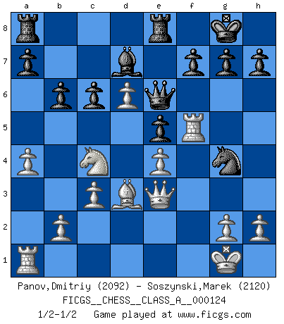 Last move : 1/2-1/2 2012 October 13 18:49:22 [Event "FICGS__CHESS__CLASS_A__000124"] [Site "FICGS"] [Date "2012.08.13"] [Round "1"] [White "Panov,Dmitriy"] [Black "Soszynski,Marek"] [Result "1/2-1/2"] [WhiteElo "2092"] [BlackElo "2120"] 1.e4 b6 2.d4 Bb7 3.Bd3 Nf6 4.Qe2 Nc6 5.c3 e5 6.Nf3 d6 7.O-O Be7 8.d5 Nb8 9.Nh4 Bc8 10.f4 O-O 11.Nf3 Nbd7 12.Na3 Re8 13.fxe5 Nxe5 14.Nxe5 dxe5 15.Bg5 Bg4 16.Qf2 Bc5 17.Be3 Bxe3 18.Qxe3 Bd7 19.Nc4 Qe7 20.a4 c6 21.d6 Qe6 22.Rf5 Ng4 1/2-1/2 Owen defense Kingside Castling by player White (move 7) Kingside Castling by player Black (move 10) This chess game ended in a draw. Follow this game move after move (download)There are tough players and nice guys, and I'm a tough player. (Bobby Fischer) Es genügt nicht ein guter Spieler zu sein, man muß auch gut spielen. (Siegbert Tarrasch) La mitad de las variaciones que son calculadas en una partida de torneo, resultan ser completamente superfluas. Desafortunadamente, nadie sabe por adelantado cual mitad. (Jan Tinman) Les échecs, c'est la lutte contre l'erreur. (Johannes Zukertort) Your best chance to get a Royal Flush in a casino is in the bathroom. (Anonymous)