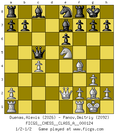 Last move : 1/2-1/2 2012 September 20 16:19:43 [Event "FICGS__CHESS__CLASS_A__000124"] [Site "FICGS"] [Date "2012.08.13"] [Round "1"] [White "Duenas,Alexis"] [Black "Panov,Dmitriy"] [Result "1/2-1/2"] [WhiteElo "2026"] [BlackElo "2092"] 1.d4 Nf6 2.c4 e6 3.Nc3 Bb4 4.Qc2 O-O 5.Nf3 c5 6.dxc5 Na6 7.g3 Nxc5 8.Bg2 Nce4 9.O-O Nxc3 10.bxc3 Be7 11.e4 d6 12.e5 dxe5 13.Nxe5 Qc7 14.Qe2 Bd6 15.Bf4 Ne8 16.c5 Qxc5 17.c4 Be7 1/2-1/2 Nimzo-Indian : Classical variation Kingside Castling by player Black (move 4) Kingside Castling by player White (move 9) This chess game ended in a draw. Follow this game move after move (download)We cannot resist the fascination of sacrifice, since a passion for sacrifices is part of a Chessplayer's nature. (Rudolf Spielman) Viele Opfer benötigen überhaupt keine konkrete Berechnung. Es genügt sich die entstehende Position kurz vorzustellen, um uns davon zu überzeugen, dass das Opfer korrekt ist. (Mikhail Nekhemyevich Tal) El Ajedrez es un mar en el cual un mosquito puede beber y un elefante puede bañarse. (Refrán Hindú) Pour moi, les échecs ne sont pas un jeu mais un art. (Alexandre Alekhine) The problem with manipulation is that people can turn on you. (Horatio Caine, C.S.I. Miami)