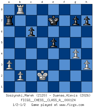 Last move : 1/2-1/2 2012 August 22 23:10:26 [Event "FICGS__CHESS__CLASS_A__000124"] [Site "FICGS"] [Date "2012.08.13"] [Round "1"] [White "Soszynski,Marek"] [Black "Duenas,Alexis"] [Result "1/2-1/2"] [WhiteElo "2120"] [BlackElo "2026"] 1.d4 d5 2.c4 e6 3.Nc3 Nf6 4.cxd5 exd5 5.Bg5 Be7 6.Qc2 c6 7.e3 Nbd7 8.Nf3 O-O 9.Bd3 Re8 10.h3 Nf8 11.Bf4 Bd6 12.Bxd6 Qxd6 13.O-O-O Be6 14.Kb1 b5 15.Rc1 a6 16.Ne2 Ne4 17.Nf4 Rac8 18.g4 a5 19.Bxe4 dxe4 20.Nd2 Bd5 21.Qc5 Qxc5 22.Rxc5 Ne6 23.Nxe6 fxe6 24.f4 exf3 25.e4 Bc4 26.Nxc4 bxc4 27.Rf1 Rf8 28.Rf2 Rf4 29.Kc2 Rd8 30.Kc3 Rxe4 31.Rxf3 Rexd4 32.Rxa5 Rd3+ 33.Rxd3 cxd3 34.Kd2 Kf7 35.Rc5 Rd4 36.Rc3 Ke7 37.Rxd3 Ra4 38.a3 e5 39.Rb3 Ra7 40.Rb8 1/2-1/2 QGD : Exchange, positional line Kingside Castling by player Black (move 8) Queenside Castling by player White (move 13) This chess game ended in a draw. Follow this game move after move (download)I guess a certain amount of temperament is expected of Chess geniuses. (Ron Gross) Wie gewinnt Tal? Er entwickelt alle seine Figuren in die Brettmitte und opfert sie dann irgendwo. (Robert James Fischer) En un gambito tu regalas un Peón por el bién de tomar un juego perdido. (Samuel Standige Boden) Je menace de comprendre la position. (Anonyme) Life is the sum of all your choices. (Albert Camus)