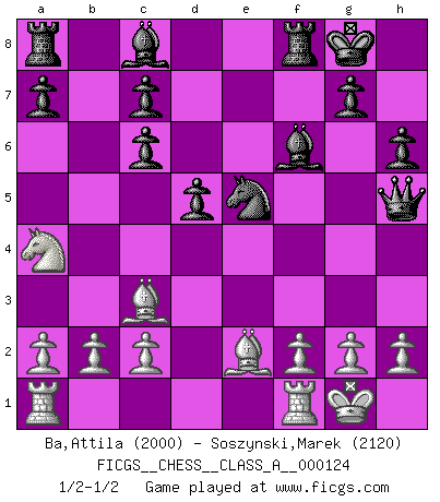 Last move : 1/2-1/2 2012 August 15 8:45:5 [Event "FICGS__CHESS__CLASS_A__000124"] [Site "FICGS"] [Date "2012.08.13"] [Round "1"] [White "Ba,Attila"] [Black "Soszynski,Marek"] [Result "1/2-1/2"] [WhiteElo "2000"] [BlackElo "2120"] 1.e4 e5 2.Nf3 Nc6 3.d4 exd4 4.Nxd4 Nf6 5.Nxc6 bxc6 6.Bd3 d5 7.Qe2 Bb4+ 8.Bd2 Be7 9.Nc3 O-O 10.e5 Nd7 11.Na4 f6 12.Qh5 h6 13.exf6 Bxf6 14.O-O Ne5 15.Be2 Qe8 16.Bc3 Qxh5 1/2-1/2 Scotch : Schmidt variation Kingside Castling by player Black (move 9) Kingside Castling by player White (move 14) This chess game ended in a draw. Follow this game move after move (download)For surely of all the drugs in the world, Chess must be the most permanently pleasurable. (Assiac) Die westlichen Werte sind eine Sprache, welche die Putin-Administration nicht versteht. (Garry Kasparov) Los Peones son el alma de una partida de Ajedrez. (Francois Andre Danican Philidor) Les Echecs mettent en conflit, non pas deux intelligences, mais deux volontés. (Lasker) The leaves of memory seemed to make a mournful rustling in the dark. (Henry Wadsworth Longfellow)