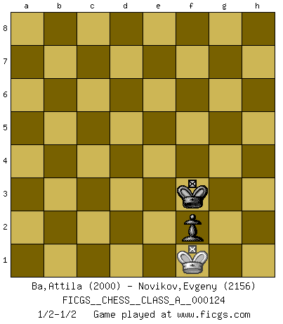 Last move : 1/2-1/2 2013 January 10 10:22:55 [Event "FICGS__CHESS__CLASS_A__000124"] [Site "FICGS"] [Date "2012.08.13"] [Round "1"] [White "Ba,Attila"] [Black "Novikov,Evgeny"] [Result "1/2-1/2"] [WhiteElo "2000"] [BlackElo "2156"] 1.e4 e5 2.Nf3 Nc6 3.d4 exd4 4.Nxd4 Bb4+ 5.c3 Bc5 6.Be3 Bb6 7.Qg4 Qf6 8.Qg3 Qg6 9.Nb5 Kd8 10.Qf4 Qf6 11.Nd2 Qxf4 12.Bxf4 a6 13.Na3 Nf6 14.f3 Re8 15.Nc2 d6 16.O-O-O Be6 17.b3 Nh5 18.Bg5+ f6 19.Be3 Bxe3 20.Nxe3 g6 21.Kb2 b5 22.g3 f5 23.f4 fxe4 24.Nxe4 Bxb3 25.axb3 Rxe4 26.Re1 Re8 27.Bg2 Kd7 28.Nd5 Rf8 29.Bh3+ Kd8 30.Re2 Nf6 31.Nxf6 Rxf6 32.Bg2 Kd7 33.h4 Rh8 34.Rhe1 h6 35.Be4 a5 36.Ra1 Rg8 37.Bxc6+ Kxc6 38.Rxa5 Rh8 39.c4 bxc4 40.bxc4 Rf5 41.Rxf5 gxf5 42.h5 Rg8 43.Re3 Kc5 44.Kc3 Ra8 45.Kb3 Kd4 46.Re6 Kd3 47.Rxh6 Rb8+ 48.Ka2 Kc2 49.Ka3 Kc3 50.Ka2 Rb2+ 51.Ka3 Rb1 52.Ka2 Rh1 53.Rh7 c5 54.Rh6 Kxc4 55.Rxd6 Rxh5 56.Kb2 Rh2+ 57.Kc1 Kc3 58.Kd1 c4 59.Rd5 Rh5 60.Rb5 Kd3 61.Rd5+ Ke3 62.Ra5 Kf3 63.Rc5 Kxg3 64.Rxc4 Rh4 65.Ke2 Rxf4 66.Rxf4 Kxf4 67.Kf2 Ke4 68.Ke2 f4 69.Kf2 f3 70.Kf1 Ke3 71.Ke1 f2+ 72.Kf1 Kf3 1/2-1/2 Scotch game Queenside Castling by player White (move 16) 10 pieces endgame at move 54 : White KRPPP , Black KRPPP WHITE : King + 1 Rook 3 Pawns BLACK : King + 1 Rook 3 Pawns 9 pieces endgame at move 55 : White KRPPP , Black KRPP WHITE : King + 1 Rook 3 Pawns BLACK : King + 1 Rook 2 Pawns 8 pieces endgame at move 55 : White KRPP , Black KRPP WHITE : King + 1 Rook 2 Pawns BLACK : King + 1 Rook 2 Pawns 7 pieces endgame at move 63 : White KRP , Black KRPP WHITE : King + 1 Rook 1 Pawn BLACK : King + 1 Rook 2 Pawns 6 pieces endgame at move 64 : White KRP , Black KRP WHITE : King + 1 Rook 1 Pawn BLACK : King + 1 Rook 1 Pawn 5 pieces endgame at move 65 : White KR , Black KRP WHITE : King + 1 Rook BLACK : King + 1 Rook 1 Pawn 4 pieces endgame at move 66 : White KR , Black KP WHITE : King + 1 Rook BLACK : King + 1 Pawn 3 pieces endgame at move 66 : White K , Black KP WHITE : King + BLACK : King + 1 Pawn This chess game ended in a draw. Follow this game move after move (download)Chess problems demand from the composer the same virtues that characterize all worthwhile art: originality, invention, conciseness, harmony, complexity, and splendid insincerity. (Vladimir Nabokov) Ich habe Putins Aufstieg an die Macht beobachtet und seine Politik, die demokratischen Institutionen meines Landes zu zerstören. (Garry Kasparov) El Ajedrez es un mar en el cual un mosquito puede beber y un elefante puede bañarse. (Refrán Hindú) Ne tendez aucun piège pour le plaisir ! Ne jouez rien dans l'espoir que l'adversaire réagisse de façon stupide ! Prenez toujours pour acquis que l'adversaire va trouver le meilleur coup ! Ne jouez jamais de coup dans l'espoir que l'adversaire ne voie pas la menace ! Chacun de vos coups doit améliorer la position d'une façon ou d'une autre. The beginning of wisdom is silence. The second step is listening. (Unknown)