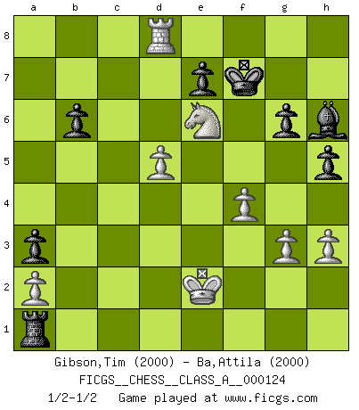Last move : 1/2-1/2 2012 October 28 2:18:28 [Event "FICGS__CHESS__CLASS_A__000124"] [Site "FICGS"] [Date "2012.08.13"] [Round "1"] [White "Gibson,Tim"] [Black "Ba,Attila"] [Result "1/2-1/2"] [WhiteElo "2000"] [BlackElo "2000"] 1.d4 Nf6 2.f3 d5 3.e4 c5 4.e5 Nfd7 5.c3 g6 6.f4 a6 7.dxc5 Nxc5 8.Be3 Ne6 9.Nd2 Bh6 10.g3 O-O 11.Ngf3 a5 12.Be2 Nc6 13.O-O a4 14.b4 d4 15.cxd4 Nxb4 16.Ne4 Nd5 17.Bd2 Bd7 18.Rb1 Bc6 19.Bb5 Bxb5 20.Rxb5 Qd7 21.Qe2 b6 22.R5b1 Bg7 23.Qb5 Qxb5 24.Rxb5 Nec7 25.R5b1 Rfc8 26.Rfc1 Bf8 27.Kf2 Ne6 28.Kg2 Kg7 29.h3 h5 30.Nc3 Nxc3 31.Bxc3 Nc7 32.e6 Nd5 33.Bd2 fxe6 34.Ng5 Kg8 35.Nxe6 Bh6 36.Rb5 Rxc1 37.Bxc1 Rc8 38.Rxd5 Rxc1 39.Rd8+ Kf7 40.d5 Rd1 41.Kf3 a3 42.Ke2 Ra1 1/2-1/2 Blackmar-Diemer gambit Kingside Castling by player Black (move 10) Kingside Castling by player White (move 13) This chess game ended in a draw. Follow this game move after move (download)Many have become Chess Masters, no one has become the Master of Chess. (Siegbert Tarrasch) Die Idee von Capablanca, Schach als Fach in den Schulen zu lehren, ist großartig. (Fidel Castro) No soy una persona materialista y por eso, no resiento la falta o pérdida del dinero. La ausencia de cosas mundanas carece de importancia. Ya que el Ajedrez es una forma en la que puedo ser tan materialista como yo desee sin tener la necesidad de vender mi alma. (Jamie Walter Adams) Les échecs c'est le défi de l'alpiniste, toujours plus haut, prêt à tout pour monter à l'assaut du Roi ennemi. Les échecs, c'est de la musique en mouvement, un ballet majestueux pour les yeux. C'est de la poésie composée par les fantômes du passé qui au même titre que Rimbaud ou Verlaine méritent notre admiration. Les échecs, c'est de la peinture ou le moindre mouvement modifie le tableau pour en faire un Picasso ou un Van Gogh. Les échecs, c'est tout et rien, c'est la vie et la mort. Jjulie33 sur le forum de France-Echecs. Computers have lots of memory but no imagination. (Anonymous)