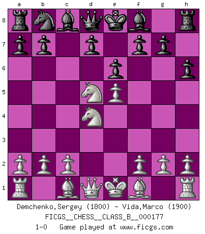 Last move : 1-0 2012 September 25 20:18:15 [Event "FICGS__CHESS__CLASS_B__000177"] [Site "FICGS"] [Date "2012.08.15"] [Round "1"] [White "Demchenko,Sergey"] [Black "Vida,Marco"] [Result "1-0"] [WhiteElo "1800"] [BlackElo "1900"] 1.e4 c5 2.Nf3 e6 3.d4 cxd4 4.Nxd4 Nf6 5.Nc3 h6 6.e5 Nd5 7.Nxd5 1-0 This chess game has been lost on time (started : 2012.08.15 11:56:23) Sicilian : Anderssen variation Player White won this chess game. Follow this game move after move (download)Life is a kind of Chess, with struggle, competition, good and ill events. (Benjamin Franklin) Woher wissen wir, daß der Neanderthaler Blindschach gespielt hat? -- Bei Ausgrabungen wurden keine Schachbretter und Figuren gefunden. (Anonymous) Nunca nadie ha ganado una partida de Ajedrez rindiendose. (Unknown) Les sacrifices démontrent seulement que quelqu'un a gaffé. (Savielly Tartacover) The human is the only animal species whose members are able to talk themselves into difficulties that would not otherwise exist. (Wendell Johnson)