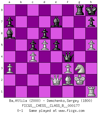 Last move : 0-1 2012 August 22 13:55:19 [Event "FICGS__CHESS__CLASS_B__000177"] [Site "FICGS"] [Date "2012.08.15"] [Round "1"] [White "Ba,Attila"] [Black "Demchenko,Sergey"] [Result "0-1"] [WhiteElo "2000"] [BlackElo "1800"] 1.d4 Nf6 2.c4 g6 3.Nc3 Bg7 4.e4 d6 5.Bd3 O-O 6.Nge2 c5 7.d5 e6 8.O-O Ng4 9.h3 Ne5 10.Nf4 Nxd3 11.Qxd3 e5 12.Nfe2 f5 13.exf5 gxf5 14.Bd2 Na6 15.a3 Qh4 16.f3 Rf6 17.Be1 Qh6 18.Ng3 Bd7 19.Ra2 Kh8 20.b3 Rg8 21.Kh1 Rf7 22.Rg1 Bf8 23.Re2 Be7 24.Bd2 Qh4 25.Nf1 f4 26.Ne4 Rfg7 27.Be1 Qh5 28.g4 fxg3 29.Nfxg3 Qh4 30.Rh2 Nc7 31.Qf1 Ne8 32.Ne2 Qh5 33.N4g3 Qg6 34.Ne4 Qf5 35.Rxg7 Nxg7 36.N2g3 Qg6 37.h4 Nh5 38.Nxh5 Qxh5 39.Qe2 Rf8 40.Kg2 b5 41.Bd2 bxc4 42.bxc4 Bf5 43.Ng3 Qg6 44.h5 Qg7 45.Rh1 Rg8 46.Be1 Bc8 47.Kf1 Rf8 48.Kg2 Ba6 49.Bd2 Rg8 50.Be1 Qg5 51.Bf2 Qf4 0-1 King's Indian : 4.e4 Kingside Castling by player Black (move 5) Kingside Castling by player White (move 8) Player Black won this chess game. Follow this game move after move (download)Up to this point White has been following well-known analysis. But now he makes a fatal error: he begins to use his own head. (Siegbert Tarrasch) Wenn ein Kopf und ein Buch zusammenstoßen und es klingt hohl, ist es denn allemal im Buche? (Georg Christoph Lichtenberg) El Ajedrez es el arte del análisis. (Mikhail Botvinnik) Toutes choses étant égales, c'est la conviction qui gagne. Alliée à une volonté de vaincre, elle sert de détonateur, suscite des idées, disperse les doutes et aide à penser clairement. (Robert Fischer) A journey of a thousand sites begins with a single click. (Author unknown)