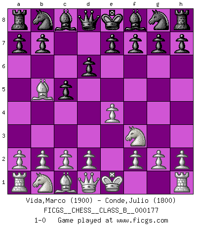 Last move : 1-0 2012 September 28 21:3:53 [Event "FICGS__CHESS__CLASS_B__000177"] [Site "FICGS"] [Date "2012.08.15"] [Round "1"] [White "Vida,Marco"] [Black "Conde,Julio"] [Result "1-0"] [WhiteElo "1900"] [BlackElo "1800"] 1.e4 c5 2.Nf3 d6 3.Bb5+ 1-0 This chess game has been lost on time (started : 2012.08.15 11:56:23) Sicilian : Canal-Sokolsky (Nimzovich-Rossolimo, Moscow) attack Player White won this chess game. Follow this game move after move (download)No other master has such a terrific will to win. At the board he radiates danger, and even the strongest opponents tend to freeze, like rabbits when they smell a panther. Even his weaknesses are dangerous. As white, his opening game is predictable - you can make plans against it - but so strong that your plans almost never work. In the middle game his precision and invention are fabulous, and in the end game you simply cannot beat him. (Anonymous German Expert) Es genügt nicht ein guter Spieler zu sein, man muß auch gut spielen. (Siegbert Tarrasch) Un buen sacrificio es aquel que aunque no sea necesariamente sólido, deja a tu oponente aturdido y confuso. (Rudolph Spielmann) Même si vous avez un bon coup à faire, regardez toujours s'il n'y en a pas un qui lui soit préférable. (Pedro Damiano) Question: Is 'This statement is paradoxical' a paradoxical statement ? Or is it a meta-paradox ? (Normajean Yates)