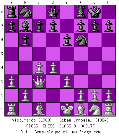 Last move : 0-1 2012 September 24 20:11:57 [Event "FICGS__CHESS__CLASS_B__000177"] [Site "FICGS"] [Date "2012.08.15"] [Round "1"] [White "Vida,Marco"] [Black "Gibas,Jaroslaw"] [Result "0-1"] [WhiteElo "1900"] [BlackElo "1984"] 1.d4 Nf6 2.c4 e6 3.Nc3 Bb4 4.Qc2 O-O 5.e3 b6 6.a3 Bxc3+ 7.Qxc3 Bb7 0-1 This chess game has been lost on time (started : 2012.08.15 11:56:23) Nimzo-Indian : Classical variation Kingside Castling by player Black (move 4) Player Black won this chess game. Follow this game move after move (download)Play the opening like a book, the middle game like a magician, and the endgame like a machine. (Spielmann) Moralische Siege zählen nicht. (Savielly Grigorievitsch Tartakower) El Ajedrez no es una pizca de inferior al violín, y tenemos un gran número de violinistas profesionales. (Mikhail Botvinnik) Il a essayé de se convaincre qu'il pourrait empêcher toutes les erreurs et ne jamais perdre. L'horreur ! Gary Kasparov au sujet de Robert Fischer. Art disturbs, science reassures. (Georges Braque, Le Jour et la Nuit)