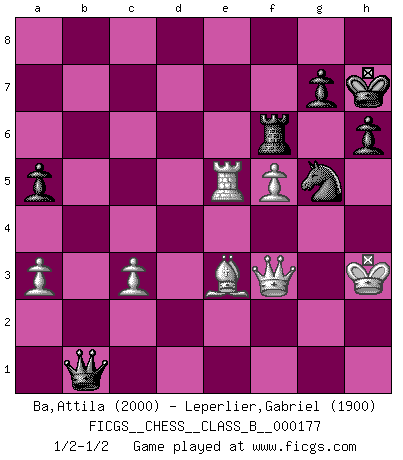 Last move : 1/2-1/2 2012 October 12 20:55:21 [Event "FICGS__CHESS__CLASS_B__000177"] [Site "FICGS"] [Date "2012.08.15"] [Round "1"] [White "Ba,Attila"] [Black "Leperlier,Gabriel"] [Result "1/2-1/2"] [WhiteElo "2000"] [BlackElo "1900"] 1.d4 f5 2.h4 Nf6 3.Nh3 e6 4.Bf4 c5 5.c3 cxd4 6.cxd4 Nc6 7.e3 Qb6 8.Qc1 Bb4+ 9.Nc3 d6 10.a3 Bxc3+ 11.bxc3 e5 12.Bh2 O-O 13.Bc4+ Kh8 14.O-O h6 15.f3 f4 16.Rb1 Qd8 17.exf4 Bxh3 18.fxe5 dxe5 19.dxe5 Nd7 20.gxh3 Ndxe5 21.Be2 Qxh4 22.f4 Nd7 23.Rxb7 Qxh3 24.Rf3 Qf5 25.Rb5 Qg6+ 26.Rg3 Qf6 27.Bd3 Qd6 28.Qd1 Nf6 29.Qf3 Rae8 30.Kh1 Re1+ 31.Rg1 Rfe8 32.Rxe1 Rxe1+ 33.Kg2 Ng4 34.Bg1 Ne3+ 35.Bxe3 Qxd3 36.Bf2 Qf1+ 37.Kg3 Re6 38.Rf5 Kh7 39.Rd5 Rf6 40.Rd1 Qb5 41.Rd5 Qa4 42.Bc5 Rg6+ 43.Kh3 Qc2 44.Bf8 a6 45.Rd3 Qb1 46.Rd5 a5 47.Bc5 Nd8 48.Be3 Ne6 49.f5 Rf6 50.Re5 Ng5+ 1/2-1/2 Dutch Kingside Castling by player Black (move 12) Kingside Castling by player White (move 14) This chess game ended in a draw. Follow this game move after move (download)A chess genius has died; a loss for humanity. (Viktor Kortchnoi, about Bobby Fischer's death) Er war ein guter Schachspieler, aber ich kann Leute nicht ausstehen, die 'Heil Hitler' rufen (Über Alexander Aljechin). (Miguel Najdorf) Haz el enroque temprano y seguido. (Rob Sillars) L'attaque fait le spectacle, la défense gagne les matchs. (Dicton footballistique) Gambling is the son of avarice and the father of despair. (French proverb)