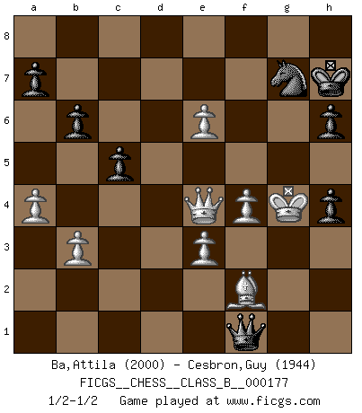 Last move : 1/2-1/2 2013 March 1 23:37:3 [Event "FICGS__CHESS__CLASS_B__000177"] [Site "FICGS"] [Date "2012.08.15"] [Round "1"] [White "Ba,Attila"] [Black "Cesbron,Guy"] [Result "1/2-1/2"] [WhiteElo "2000"] [BlackElo "1944"] 1.d4 f5 2.g3 Nf6 3.Bg2 e6 4.Nf3 Be7 5.c4 O-O 6.O-O Ne4 7.Qc2 Bf6 8.Nc3 d5 9.Bf4 c6 10.Rac1 Nd7 11.Rfd1 g5 12.Be3 Nd6 13.cxd5 exd5 14.b3 Re8 15.Qd2 h6 16.Rc2 Qe7 17.h4 f4 18.gxf4 gxh4 19.Ne5 Nb6 20.Kh2 Bf5 21.Rg1 Kh8 22.Bh3 Qe6 23.Bxf5 Nxf5 24.R2c1 Rg8 25.Qd3 Be7 26.Bd2 Nd7 27.Rce1 Rad8 28.Nd1 Nxe5 29.dxe5 d4 30.Qf3 Bc5 31.e4 dxe3 32.Bxe3 Bb4 33.Rxg8+ Rxg8 34.Rg1 Rxg1 35.Kxg1 b6 36.Kh2 Kg7 37.Bc1 Bc5 38.Ne3 Bxe3 39.Qg4+ Kf7 40.fxe3 c5 41.Qh5+ Kg7 42.Qf3 Kf7 43.Bd2 Qd7 44.Be1 Qd3 45.Bf2 Qd2 46.Kh3 Qd3 47.Kh2 Qd2 48.Kh3 Qd3 49.Kg2 Qc2 50.a3 Qd3 51.Kh2 Qd2 52.Kg2 Qd3 53.Kh2 Qd2 54.a4 Qc2 55.Kh3 Qd3 56.Qc6 Qf1+ 57.Kg4 Ng7 58.e6+ Kg8 59.Qa8+ Kh7 60.Qe4+ 1/2-1/2 Dutch defense Kingside Castling by player Black (move 5) Kingside Castling by player White (move 6) This chess game ended in a draw. Follow this game move after move (download)The beauty of a move lies not in its' appearance but in the thought behind it. (Siegbert Tarrasch) Ich glaube, ich kenne inzwischen die Gründe für mein Versagen: schachliche Charakterfehler. Ich war nie ein Wunderkind und in meiner gesamten menschlichen Entwicklung immer zu langsam. (Viktor Kortschnoi) La última cosa en que Fischer estaba interesado era en tonterías, siempre y cuando el Ajedrez estuviera involucrado. (Elie Agur) Le profane ne songe pas à la somme de jouissance dont il se prive, qui méconnaît ce jeu aux ressources aussi variées que passionnantes. (Jean-Marie Jeanton-Lamarche) Control your own destiny or someone else will. (Jack Welch)