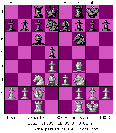 Last move : 1-0 2012 October 18 22:3:47 [Event "FICGS__CHESS__CLASS_B__000177"] [Site "FICGS"] [Date "2012.08.15"] [Round "1"] [White "Leperlier,Gabriel"] [Black "Conde,Julio"] [Result "1-0"] [WhiteElo "1900"] [BlackElo "1800"] 1.d4 Nf6 2.c4 e6 3.Nf3 Be7 4.Nc3 d5 5.Bf4 Bd7 6.e3 O-O 7.Bd3 Bc6 8.cxd5 exd5 9.O-O Nbd7 10.Rc1 Rc8 11.Qc2 1-0 Queen's pawn game Kingside Castling by player Black (move 6) Kingside Castling by player White (move 9) Player White won this chess game. Follow this game move after move (download)There's never before been a Chess player with such a thorough knowledge of the intricacies of the game and such an absolutely indomitable will to win. I think Bobby is the greatest player that ever lived. (Lisa Lane) Dass jemand wie Surab Asmaiparaschwili, der selbst Elopunkte gekauft hat , Vize-Präsident der Fide werden konnte, sagt schon einges über den Zustand dieser Organisation aus. (Joel Lautier) Un buen jugador siempre tiene buena suerte. (José Raúl Capablanca) L'ordinateur a tué l'originalité. Il n'y a plus guère d'aventures sur l'échiquier. (Jacob Murray) Creativity is allowing yourself to make mistakes. Art is knowing which ones to keep. (Scott Adams)