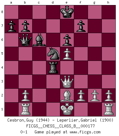 Last move : 0-1 2012 November 10 0:45:50 [Event "FICGS__CHESS__CLASS_B__000177"] [Site "FICGS"] [Date "2012.08.15"] [Round "1"] [White "Cesbron,Guy"] [Black "Leperlier,Gabriel"] [Result "0-1"] [WhiteElo "1944"] [BlackElo "1900"] 1.e4 e6 2.d4 d5 3.Nc3 Bb4 4.e5 c5 5.Qg4 Ne7 6.dxc5 Nbc6 7.Qxg7 Rg8 8.Qxh7 d4 9.a3 Qa5 10.Rb1 dxc3 11.Be3 Bd7 12.Ne2 Rg6 13.Qh8+ Ng8 14.axb4 Nxb4 15.Nxc3 Nxc2+ 16.Kd2 Nxe3 17.Kxe3 Qxc5+ 18.Ke2 Rd8 19.Qh3 Ne7 20.Qe3 Qb4 21.Qe4 Qb3 22.Ke1 Bc6 23.Qf4 Qb6 24.Qe3 Rd4 25.Ne2 R6g4 26.Nxd4 Rxd4 27.Be2 Nd5 0-1 French : Winawer, Advance, Russian variation Player Black won this chess game. Follow this game move after move (download)I love all positions. Give me a difficult positional game, I will play it. But totally won positions, I cannot stand them. (Hein Donner) Es macht mich traurig, wenn ich sehe, dass Golfprofis mehr verdienen als Schachsportler. Obwohl ich davon überzeugt bin, dass wir Schachspieler viel härter trainieren müssen als die Golfer. (Alexandra Kosteniuk) Tu eres para mi la Reina en d8 y yo soy el Peón en d7!!. (GM Eduard Gufeld) D'abord les bases : Jouez et étudiez, puis étudiez et jouez, ensuite jouez et étudiez, puis étudiez et jouez. Deuxièmement : Donnez toujours le meilleur de vous-même ! (Ken Smith) Don't anthropomorphize computers - they hate it. (Anonymous)