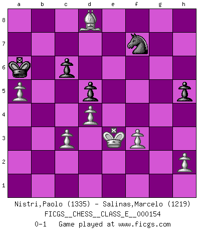 Last move : 0-1 2013 July 15 3:19:53 [Event "FICGS__CHESS__CLASS_E__000154"] [Site "FICGS"] [Date "2012.08.15"] [Round "1"] [White "Nistri,Paolo"] [Black "Salinas,Marcelo"] [Result "0-1"] [WhiteElo "1335"] [BlackElo "1219"] 1.d4 e6 2.Nf3 Nc6 3.Nbd2 Qf6 4.c3 d5 5.e3 e5 6.dxe5 Nxe5 7.Nxe5 Qxe5 8.Nf3 Qf6 9.Be2 Be6 10.O-O Bd6 11.Qd4 h6 12.Qxf6 Nxf6 13.b3 O-O 14.Bb2 Bg4 15.Nd4 Bxe2 16.Nxe2 Ne4 17.Rad1 c6 18.Rd4 a5 19.a3 Be5 20.R4d1 f5 21.Nd4 Bxd4 22.exd4 g5 23.f3 Nd6 24.Rfe1 Rae8 25.Kf1 g4 26.Rxe8 Rxe8 27.Re1 Kf7 28.Rxe8 Kxe8 29.Ke2 Ke7 30.Kd3 gxf3 31.gxf3 f4 32.Bc1 Nf7 33.Bxf4 h5 34.Bc7 Ng5 35.Ke2 b5 36.Bxa5 Ke6 37.Bd8 Nf7 38.Bh4 Nh6 39.a4 bxa4 40.bxa4 Kd7 41.a5 Kc7 42.Be7 Kb7 43.Bd8 Ka6 44.Ke3 Nf7 0-1 Queen's pawn Kingside Castling by player White (move 10) Kingside Castling by player Black (move 13) Player Black won this chess game. Follow this game move after move (download)The winner of the game is the player who makes the next-to-last mistake. (Savielly Tartakover) In der Schule lernt man nichts. Es ist nur Zeitverschwendung. (Robert James Fischer) Morphy probablemente fue el genio más grande de todos. (Bobby Fischer) Vous savez, camarade Pachman, je n'éprouve pas de plaisir à être ministre, je jouerais plutôt aux échecs comme vous, ou alors ferais une révolution au Venezuela. (Che Guevara à Ludek Pachman, 'Checkmate in Prague', 1975) The Internet is the first thing that humanity has build that humanity doesn't understand, the largest experiment in anarchy that we have ever had. (Eric Schmidt)