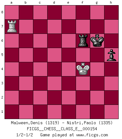Last move : 1/2-1/2 2013 March 13 21:51:41 [Event "FICGS__CHESS__CLASS_E__000154"] [Site "FICGS"] [Date "2012.08.15"] [Round "1"] [White "Malween,Denis"] [Black "Nistri,Paolo"] [Result "1/2-1/2"] [WhiteElo "1319"] [BlackElo "1335"] 1.e4 d5 2.e5 c5 3.c3 Nc6 4.f4 e6 5.Nf3 Nge7 6.Bb5 a6 7.Bxc6+ Nxc6 8.d4 Be7 9.Be3 O-O 10.h4 cxd4 11.cxd4 b5 12.g4 Qa5+ 13.Nbd2 Bb4 14.a3 Bxd2+ 15.Bxd2 Qb6 16.Be3 Bb7 17.f5 Na5 18.f6 Nc4 19.fxg7 Kxg7 20.Bh6+ Kxh6 21.Qc1+ Kg7 22.Qg5+ Kh8 23.Qf6+ Kg8 24.h5 Qd8 25.Qh6 f6 26.O-O fxe5 27.Qxe6+ Kh8 28.b3 Qf6 29.Qxf6+ Rxf6 30.bxc4 e4 31.Ne5 Rxf1+ 32.Rxf1 dxc4 33.Rf7 Bd5 34.Rd7 Be6 35.Rd6 Bxg4 36.Nxg4 Rg8 37.Rxa6 e3 38.Kg2 Rxg4+ 39.Kf3 Rxd4 40.h6 Kg8 41.Kxe3 Rd3+ 42.Ke4 Rb3 43.Kd4 Kf7 44.a4 bxa4 45.Rxa4 Rb6 46.Ra7+ Kg6 47.Kxc4 Kxh6 48.Kd5 Kg6 49.Ke5 h5 50.Kf4 Rf6+ 1/2-1/2 Scandinavian (centre counter) defense Kingside Castling by player Black (move 9) Kingside Castling by player White (move 26) 10 pieces endgame at move 39 : White KRPP , Black KRPPPP WHITE : King + 1 Rook 2 Pawns BLACK : King + 1 Rook 4 Pawns 9 pieces endgame at move 41 : White KRPP , Black KRPPP WHITE : King + 1 Rook 2 Pawns BLACK : King + 1 Rook 3 Pawns 8 pieces endgame at move 44 : White KRP , Black KRPPP WHITE : King + 1 Rook 1 Pawn BLACK : King + 1 Rook 3 Pawns 7 pieces endgame at move 45 : White KRP , Black KRPP WHITE : King + 1 Rook 1 Pawn BLACK : King + 1 Rook 2 Pawns 6 pieces endgame at move 47 : White KRP , Black KRP WHITE : King + 1 Rook 1 Pawn BLACK : King + 1 Rook 1 Pawn 5 pieces endgame at move 47 : White KR , Black KRP WHITE : King + 1 Rook BLACK : King + 1 Rook 1 Pawn This chess game ended in a draw. Follow this game move after move (download)The passed Pawn is a criminal, who should be kept under lock and key. Mild measures, such as police surveillance, are not sufficient. (Aaron Nimzovich) Die unerbitterlichsten Regeln im Schach sind die Ausnahmen. (Savielly Grigorievitsch Tartakower) Sin errores no puede haber brillantez. (Emanuel Lasker) Le joueur d'Echecs qui veut atteindre le top est obligé de développer son propre credo créatif. Alexeï Stepanovicth Souétine. Il est facile d'écrire des livres ! Ce qui est difficile, c'est de jouer ! (Alexeï Stepanovicth Souétine) I live to kill Traxler counterattack. (Ilmars Cirulis)