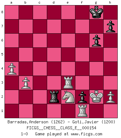 Last move : 1-0 2012 August 29 15:17:18 [Event "FICGS__CHESS__CLASS_E__000154"] [Site "FICGS"] [Date "2012.08.15"] [Round "1"] [White "Barradas,Anderson"] [Black "Goti,Javier"] [Result "1-0"] [WhiteElo "1262"] [BlackElo "1200"] 1.e4 c5 2.Nf3 Nc6 3.d4 cxd4 4.Nxd4 g6 5.Nc3 Bg7 6.Nxc6 bxc6 7.Bd3 e6 8.Bf4 Nf6 9.O-O d5 10.exd5 cxd5 11.Be5 a6 12.Na4 O-O 13.Nc5 Bh6 14.Qf3 Nh5 15.Rad1 f6 16.Bc3 e5 17.Bc4 Nf4 18.b3 e4 19.Bxd5+ Nxd5 20.Nxe4 Bg7 21.Bb2 Bf5 22.Ng3 Bxc2 23.Rxd5 Qe7 24.Rd2 Rac8 25.Bc3 Bf5 26.Ne2 Be4 27.Qg3 Bh6 28.Rd4 f5 29.Bb4 f4 30.Bxe7 fxg3 31.Bxf8 gxf2+ 32.Kh1 Bxg2+ 33.Kxg2 Rxf8 34.Rh4 Be3 35.Re4 Bb6 36.Re6 Ba7 37.Rxa6 Be3 38.a4 Rd8 39.Re6 Rd2 40.Rxe3 1-0 Sicilian : Accelerated Fianchetto, Modern variation Kingside Castling by player White (move 9) Kingside Castling by player Black (move 12) Player White won this chess game. Follow this game move after move (download)A win by an unsound combination, however showy, fills me with artistic horror. (Wilhelm Steinitz) Kritik überlasse ich den Spießern. Ich zeige nichts, wofür ich mich schämen muss. (Alexandra Kosteniuk) Alguna parte de un error es siempre correcto. (Savielly Tartakover) En blitz, le Cavalier l'emporte sur le Fou. (Vlastimil Hort) Warrior pose battles inner weakness and wins focus. You see that there is no war within you. You're on your own side, and you are your own strength. (Terri Guillemets)