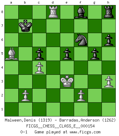 Last move : 0-1 2012 October 16 10:1:14 [Event "FICGS__CHESS__CLASS_E__000154"] [Site "FICGS"] [Date "2012.08.15"] [Round "1"] [White "Malween,Denis"] [Black "Barradas,Anderson"] [Result "0-1"] [WhiteElo "1319"] [BlackElo "1262"] 1.e4 c6 2.d4 d5 3.Nc3 dxe4 4.Nxe4 Nf6 5.Ng5 h6 6.Nxf7 Kxf7 7.Bc4+ Ke8 8.Nf3 Bg4 9.Ne5 Qa5+ 10.Qd2 Qxd2+ 11.Bxd2 Bh5 12.h3 b5 13.Bb3 Nbd7 14.g4 Nxe5 15.gxh5 Nf3+ 16.Ke2 Nxd4+ 17.Ke3 Nxb3 18.axb3 Nxh5 19.Ra6 Kd7 20.Rha1 Kc7 21.Rxa7+ Rxa7 22.Rxa7+ Kb6 23.Ra8 Kb7 24.Rd8 Nf6 25.c4 bxc4 26.bxc4 e5 27.Ke2 Ne4 28.Bb4 c5 29.Ba5 Nf6 30.Ke3 g5 0-1 Caro-Kann defense Player Black won this chess game. Follow this game move after move (download)The laws of Chess do not permit a free choice: you have to move whether you like it or not. (Emanuel Lasker) Jede Eröffnung ist gut genug um gespielt zu werden, wenn nur ihr Ruf schlecht genug ist. (Savielly Grigorievitsch Tartakower) Peones: ellos son el alma de esta partida, solos forman el ataque y la defensa. (Philidor) Ce n'est pas pour s'amuser qu'il joue aux échecs : il célèbre un culte. (Vladimir Nabokov) Bobby never cared about money, though. His only desire was to prove that his choices were correct: He wanted chess to be important because he was a chess player, and he wanted to be important. Bobby knew money was important, but he didn't have a clue why, outside of clothes and status. The only way he could accomplish what he wanted was to fight for a lot of money. Once he got it, he gave it away. He did not know how to spend it. And once he'd become champion, after, essentially, sacrificing his life for it, he didn't know how to spend his time. (Bob Wade)