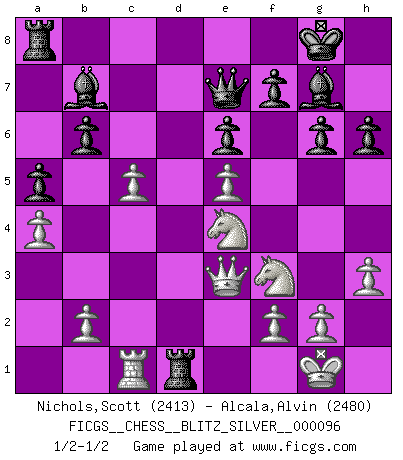 Last move : 1/2-1/2 2012 August 15 17:52:18 [Event "FICGS__CHESS__BLITZ_SILVER__000096"] [Site "FICGS"] [Date "2012.08.15"] [Round "1"] [White "Nichols,Scott"] [Black "Alcala,Alvin"] [Result "1/2-1/2"] [WhiteElo "2413"] [BlackElo "2480"] 1.d4 Nf6 2.c4 c6 3.Nf3 d5 4.Nc3 e6 5.Bg5 h6 6.Bxf6 Qxf6 7.e3 Nd7 8.Qc2 g6 9.Bd3 dxc4 10.Bxc4 Bg7 11.O-O Qe7 12.Rfd1 O-O 13.a4 a5 14.e4 b6 15.h3 Bb7 16.e5 Rfd8 17.Qe2 Nb8 18.Rac1 Na6 19.Bxa6 Bxa6 20.Qe3 Bb7 21.Ne4 c5 22.dxc5 Rxd1+ 1/2-1/2 Queen's pawn game Kingside Castling by player White (move 11) Kingside Castling by player Black (move 12) This chess game ended in a draw. Follow this game move after move (download)Openings teach you openings. Endgames teach you chess ! (Stephan Gerzadowicz) Ein Großmeister muß tausende Partien in seinem Kopf speichern, denn diese sind für Ihn, was die Worte der Muttersprache für gewöhnliche Leute sind, oder Noten für Musiker... (Garry Kasparov) El Ajedrez moderno está demasiado preocupado con cosas como la estructura de Peones. Olvidenlo, el Jaque Mate termina la partida. (Nigel Short) Fischer est le meilleur joueur du monde et Karpov n'est qu'un joueur de bistrot. (Garry Kasparov, agé de 16 ans) Heh, heh, heh. Time to abandon ship. (General Grievous in Star Wars ep.3)