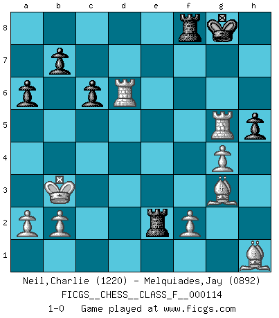 Last move : 1-0 2012 October 12 18:2:23 [Event "FICGS__CHESS__CLASS_F__000114"] [Site "FICGS"] [Date "2012.08.16"] [Round "1"] [White "Neil,Charlie"] [Black "Melquiades,Jay"] [Result "1-0"] [WhiteElo "1220"] [BlackElo "0892"] 1.Nf3 f6 2.e4 d5 3.exd5 Qxd5 4.Nc3 Qe6+ 5.Qe2 Qxe2+ 6.Bxe2 a6 7.Nd5 Kd8 8.d4 e6 9.Ne3 Nc6 10.Bd2 e5 11.dxe5 Nxe5 12.Nxe5 fxe5 13.O-O-O Bd6 14.Nf5 Bxf5 15.Rhe1 Ne7 16.Bf3 c6 17.g4 Bg6 18.Ba5+ Ke8 19.Rxd6 Kf7 20.Rxe5 Rhe8 21.h4 Bxc2 22.Kxc2 Ng6 23.Rf5+ Kg8 24.Bc3 Nxh4 25.Rg5 g6 26.Bh1 h6 27.Rc5 Rf8 28.Bf6 Rae8 29.Bxh4 Re2+ 30.Kb3 g5 31.Bg3 h5 32.Rxg5+ 1-0 Reti Opening Queenside Castling by player White (move 13) Player White won this chess game. Follow this game move after move (download)I'd rather have a Pawn than a finger. (Reuben Fine) Man kann eine Schachpartie nur gewinnen, wenn das Gleichgewicht gestört ist. In einer Stellung mit ungestörtem Gleichgewicht ist auch das größte Genie hilflos - in der Stellung steckt dann eben kein genialer Einfall. (Wilhelm Steinitz) Me gusta decir que Bobby Fischer fue el mejor jugador que jamás haya existido. Pero lo que hizo de Fischer un genio, fue su habilidad de mezclar una frescura y pragmatismo Americano con ideas Rusas acerca de la estrategia. (Bruce Pandolfini) Avec des compensations pour le matériel en plus... (Anonyme) Players are not good because they find tactics, it is about the way to find the positions in which those tactics are hidden. (Luc-Olivier Leclerc)