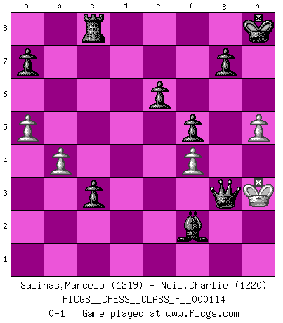 Last move : 0-1 2013 March 14 19:30:7 [Event "FICGS__CHESS__CLASS_F__000114"] [Site "FICGS"] [Date "2012.08.16"] [Round "1"] [White "Salinas,Marcelo"] [Black "Neil,Charlie"] [Result "0-1"] [WhiteElo "1219"] [BlackElo "1220"] 1.Nf3 Nf6 2.c3 d5 3.d4 e6 4.Bg5 Nbd7 5.Bxf6 Nxf6 6.Nbd2 Bd6 7.Ne5 c5 8.Qa4+ Bd7 9.Nxd7 Nxd7 10.e4 O-O 11.e5 Be7 12.Qc2 Rc8 13.Bd3 cxd4 14.Bxh7+ Kh8 15.Nf3 dxc3 16.b3 Bb4 17.a3 Ba5 18.b4 Bb6 19.O-O d4 20.Bd3 Nb8 21.Be4 Nc6 22.Ng5 Qxg5 23.Qd3 Nxe5 24.Bxb7 Nxd3 25.Bxc8 Rxc8 26.g3 Qh5 27.Rad1 Ne5 28.f4 Ng4 29.h4 Ne3 30.Rc1 Nxf1 31.Rxf1 d3 32.Kh1 d2 33.a4 d1Q 34.Rxd1 Qxd1+ 35.Kh2 Qf1 36.a5 Bg1+ 37.Kh1 f5 38.h5 Bf2 39.Kh2 Qg1+ 40.Kh3 Qxg3+ 0-1 Reti Opening Kingside Castling by player Black (move 10) Kingside Castling by player White (move 19) Promotion Queen by player Black (move 33) Player Black won this chess game. Follow this game move after move (download)I look one move ahead... the best ! (Siegbert Tarrasch) Über Frauen: Chess is better. (Robert James Fischer) Muchos jugadores de Ajedrez se sorprendían cuando después de la partida, Fischer explicaba con calma: 'Yo ya había analizado esta posibilidad' en una posición en la cual yo creía que no era posible de prever desde la apertura. (Mikhail Tal) Roi des jeux et jeu des rois, les échecs portent en eux un sentiment d'infini. Ils donnent à celui qui s'est efforcé d'en approfondir les arcanes l'impression de n'être pas à la mesure de l'homme; en fait, ils constituent un résumé de l'univers, un microcosme, et figurent cette grande échelle qui, dans les plans de la lumière descend jusqu'à la matière, qui des abîmes insondables remonte jusqu'en l'infini de Dieu. (Pyrame) Programmer - an organism that turns coffee into software. (Anonymous)