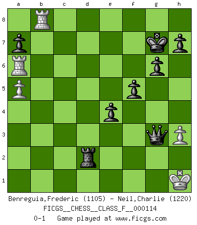Last move : 0-1 2012 October 14 18:24:33 [Event "FICGS__CHESS__CLASS_F__000114"] [Site "FICGS"] [Date "2012.08.16"] [Round "1"] [White "Benreguia,Frederic"] [Black "Neil,Charlie"] [Result "0-1"] [WhiteElo "1105"] [BlackElo "1220"] 1.b4 e5 2.a3 c5 3.bxc5 Bxc5 4.g3 Nf6 5.Bg2 d5 6.d3 Nc6 7.Nf3 Be6 8.Bb2 Ng4 9.h3 Bxf2+ 10.Kf1 Ne3+ 11.Kxf2 Nxd1+ 12.Rxd1 Qb6+ 13.e3 Qxb2 14.Nbd2 O-O 15.Rdc1 Qb6 16.c4 dxc4 17.Nxc4 Bxc4 18.dxc4 Rad8 19.Rab1 Qc7 20.a4 e4 21.Ng5 f5 22.Ne6 Qe7 23.Nxf8 Kxf8 24.c5 Ne5 25.Rc2 Nd3+ 26.Kg1 Nxc5 27.a5 Na6 28.Bf1 g6 29.Bxa6 bxa6 30.Rc6 Qa3 31.Rxa6 Qxe3+ 32.Kh1 Qf3+ 33.Kg1 Qxg3+ 34.Kh1 Rd2 35.Rb8+ Kg7 0-1 Polish (Sokolsky) opening Kingside Castling by player Black (move 14) Player Black won this chess game. Follow this game move after move (download)I give 98 percent of my mental energy to Chess. Others give only 2 percent. (Bobby Fischer) Im Schach nämlich geht es darum, daß Ich des Gegners klein zu kriegen, sein Ego zu zerbrechen und zu zermahlen, seine Selbstachtung zu zertreten und zu verscharren und seine ganze mißachtenswerte sogenannte Persönlichkeit ein für alle Mal tot zu hacken und zu zerstampfen und dadurch die menschliche Gesellschaft von einer stinkenden Pestbeule zu befreien. Es ist ein königliches Spiel. (Robert James Fischer) ¿Porque tengo que perder ante este idiota?. (Aron Nimzovich) La conception d'un plan est le processus par lequel un joueur exploite les avantages de sa position tout en s'efforçant d'en réduire au minimum les inconvénients. Afin de garantir le succès, un plan doit toujours se fonder sur un diagnostic objectif des particularités d'une position. La conception d'un plan est d'autant plus difficile que la position est équilibrée, et grandement facilitée lorsqu'il n'existe qu'un seul plan susceptible de répondre aux exigences de la position. (Harry Golombek) I don't diet. I just don't eat as much as I'd like to. (Linda Evangelista, supermodel)