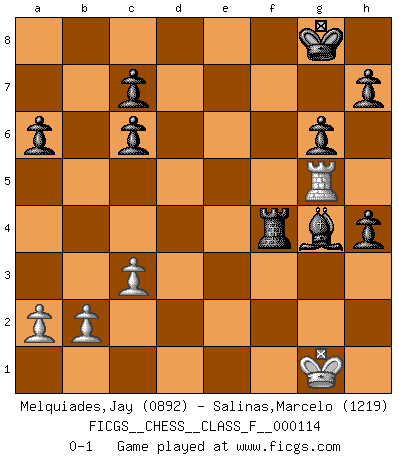 Last move : 0-1 2012 November 5 19:7:36 [Event "FICGS__CHESS__CLASS_F__000114"] [Site "FICGS"] [Date "2012.08.16"] [Round "1"] [White "Melquiades,Jay"] [Black "Salinas,Marcelo"] [Result "0-1"] [WhiteElo "0892"] [BlackElo "1219"] 1.e4 e5 2.Nf3 Nc6 3.c3 Nf6 4.d3 d5 5.Bg5 dxe4 6.dxe4 Be7 7.Bb5 O-O 8.O-O Nxe4 9.Bxe7 Qxe7 10.Re1 Nxf2 11.Qe2 Ng4 12.Nbd2 a6 13.Bxc6 bxc6 14.Ne4 Bf5 15.Neg5 Nxh2 16.Kxh2 f6 17.Nh4 fxg5 18.Qxe5 Qxe5+ 19.Rxe5 gxh4 20.Rf1 g6 21.g4 Bxg4 22.Rxf8+ Rxf8 23.Rg5 Rf2+ 24.Kg1 Rf4 0-1 Ponziani : Jaenisch counter-attack Kingside Castling by player Black (move 7) Kingside Castling by player White (move 8) Player Black won this chess game. Follow this game move after move (download)That's what Chess is all about. One day you give your opponent a lesson, the next day he gives you one. (Bobby Fischer) Schach ist Krieg, im Schach geht es um testosterongesteuerte Urschreie. (Garry Kasparov) En el Ajedrez, cuando menos, el valiente hereda la tierra. (Edmar Mednis) Il a essayé de se convaincre qu'il pourrait empêcher toutes les erreurs et ne jamais perdre. L'horreur ! Gary Kasparov au sujet de Robert Fischer. You think that education is too expensive ? Try ignorance. (Derek Bok)