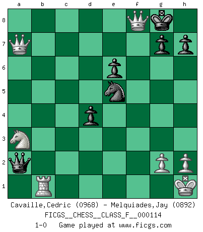 Last move : 1-0 2012 August 22 1:26:6 [Event "FICGS__CHESS__CLASS_F__000114"] [Site "FICGS"] [Date "2012.08.16"] [Round "1"] [White "Cavaille,Cedric"] [Black "Melquiades,Jay"] [Result "1-0"] [WhiteElo "0968"] [BlackElo "0892"] 1.e4 e5 2.Nf3 d6 3.Bc4 Be6 4.Bxe6 fxe6 5.b4 a5 6.bxa5 Rxa5 7.a4 Nc6 8.d4 Nxd4 9.Nxd4 exd4 10.Qxd4 Nf6 11.Nd2 c5 12.Qb2 b6 13.Nc4 Ra6 14.a5 Nxe4 15.axb6 Rxa1 16.Qxa1 Be7 17.O-O O-O 18.Be3 Bf6 19.Qa7 Bd4 20.Bxd4 cxd4 21.b7 Nc5 22.Rb1 Nd7 23.Nxd6 Qc7 24.Nb5 Qxc2 25.Na3 Qxf2+ 26.Kh1 Ne5 27.b8Q Qa2 28.Qxf8+ 1-0 Philidor's defense Kingside Castling by player White (move 17) Kingside Castling by player Black (move 17) Promotion Queen by player White (move 27) Player White won this chess game. Follow this game move after move (download)If your opponent cannot do anything active, then don't rush the position; instead you should let him sit there, suffer, and beg you for a draw. (Jeremy Silman) Mein Gehirn das ist mein zweitwichtigstes Organ [Aus dem Film: Der Schläfer]. (Woody Allen) Preferería tener un Peón que un dedo. (Reuben Fine) Karpov est une pièce de musée. (Garry Kasparov) The real voyage of discovery consists not in seeking new lands but in seeing with new eyes. (Marcel Proust)