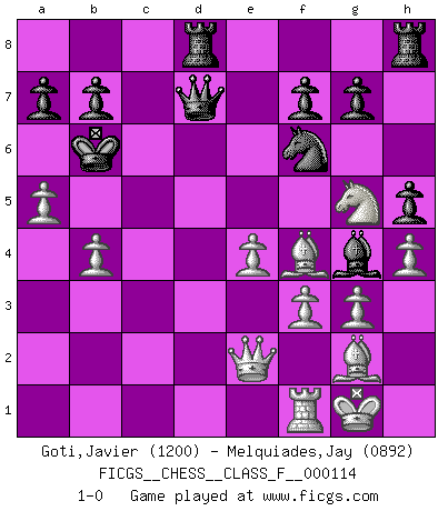 Last move : 1-0 2012 August 26 19:54:49 [Event "FICGS__CHESS__CLASS_F__000114"] [Site "FICGS"] [Date "2012.08.16"] [Round "1"] [White "Goti,Javier"] [Black "Melquiades,Jay"] [Result "1-0"] [WhiteElo "1200"] [BlackElo "0892"] 1.c4 d5 2.cxd5 Qxd5 3.Nc3 Qa5 4.d3 e6 5.Bd2 Bb4 6.a3 Bc5 7.Ne4 Qb6 8.Nxc5 Qxc5 9.Nf3 Nc6 10.Rc1 Qb5 11.b4 Nf6 12.g3 e5 13.Bg2 Bg4 14.O-O h5 15.a4 Qd5 16.Ng5 e4 17.dxe4 Qd7 18.h4 Nd4 19.f3 Nxe2+ 20.Qxe2 O-O-O 21.Rxc7+ Kxc7 22.Bf4+ Kb6 23.a5+ 1-0 English Opening Kingside Castling by player White (move 14) Queenside Castling by player Black (move 20) Player White won this chess game. Follow this game move after move (download)Don't even mention losing to me. I can't stand to think of it. (Bobby Fischer) Ich habe kein Problem mit Frauen, sondern nur mit dem Niveau ihres Schachspiels (Judith Polgar) Un Peón pasado es un criminal, quién debe ser mantenido bajo candado y llave. Leves medidas, tales como vigilancia policiaca, no son suficientes. (Aaron Nimzovich) Les Echecs représentent une sphère d'idées créatrices basée sur la volonté des deux protagonistes. (Smyslov) No man has ever achieved immortality in his own life time. (Unknown)