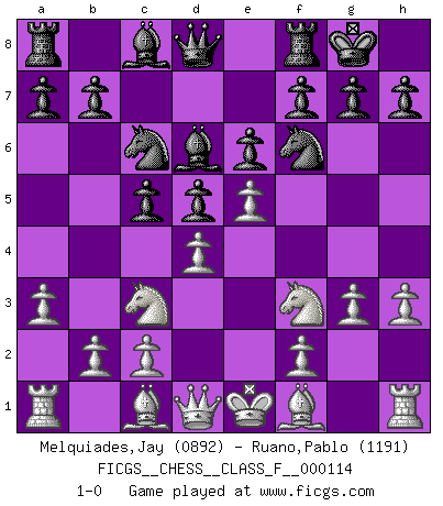 Last move : 1-0 2012 September 28 8:55:0 [Event "FICGS__CHESS__CLASS_F__000114"] [Site "FICGS"] [Date "2012.08.16"] [Round "1"] [White "Melquiades,Jay"] [Black "Ruano,Pablo"] [Result "1-0"] [WhiteElo "0892"] [BlackElo "1191"] 1.e4 c5 2.Nf3 e6 3.Nc3 Nf6 4.h3 Nc6 5.a3 d5 6.d4 Bd6 7.g3 O-O 8.e5 1-0 This chess game has been lost on time (started : 2012.08.16 13:49:9) Sicilian defense Kingside Castling by player Black (move 7) Player White won this chess game. Follow this game move after move (download)The tactician knows what to do when there is something to do; whereas the strategian knows what to do when there is nothing to do. (Gerald Abrahams) Mit sehr nachdenklichem Gesicht schreitet Bobby durch den Turniersaal. Was ist passiert?, fragt Lombardy. Ich stehe schlecht, antwortet Fischer. Lombardy: Dann biete doch einfach Remis an. Fischer: So schlecht stehe ich nun auch wieder nicht! (Robert James Fischer) El juego de Damas es para vagabundos. (Paul Morphy) Les Echecs ont trois composantes : le temps, l'espace et le matériel en dernier. (Mikhail Tal) Everything in life is luck. (Donald Trump)