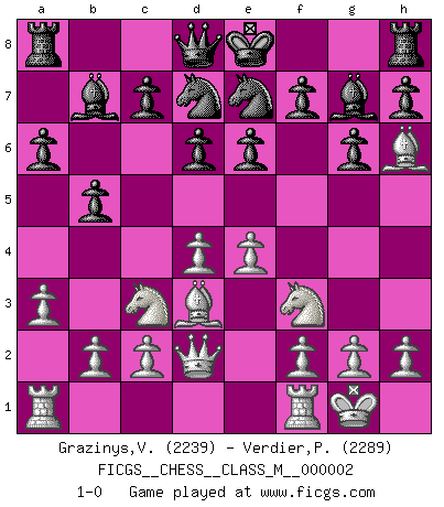 Last move : 1-0 2006 June 15 10:46:58 [Event "FICGS__CHESS__CLASS_M__000002"] [Site "FICGS"] [Date "2006.04.10"] [Round "1"] [White "Grazinys,Vidmantas"] [Black "Verdier,Patrice"] [Result "1-0"] [WhiteElo "2239"] [BlackElo "2289"] 1.e4 g6 2.d4 Bg7 3.Nc3 d6 4.Be3 a6 5.Qd2 b5 6.a3 Nd7 7.Nf3 Bb7 8.Bd3 e6 9.O-O Ne7 10.Bh6 1-0 This chess game has been lost on time (started : 2006.04.10 11:52:44) Robatsch (Modern) defense Kingside Castling by player White (move 9) Player White won this chess game. Follow this game move after move (download)The Chess pieces are the block alphabet which shapes thoughts; and these thoughts, although making a visual design on the chessboard, express their beauty abstractly, like a poem. (Marcel Duchamp) Ich organisiere ein großes Turnier, was mich etwa 120000 Dollar kostet. Ich denke, das ist das erste Mal in der Schachgeschichte, daß ein Schachgroßmeister auch als Mäzen auftritt. (Miguel Najdorf) El tablero es el mundo, las piezas es el fenomeno del universo, las reglas del juego son lo que llamamos leyes de la naturaleza y el jugador del lado opuesto, se encuentra oculto a nuestra vista. (Thomas Huxley) Les échecs, c'est l'art d'analyser. (Mikhail Botvinnik) Life is like a ten-speed bicycle: most of us have gears we never use. (Charles M. Schulz)