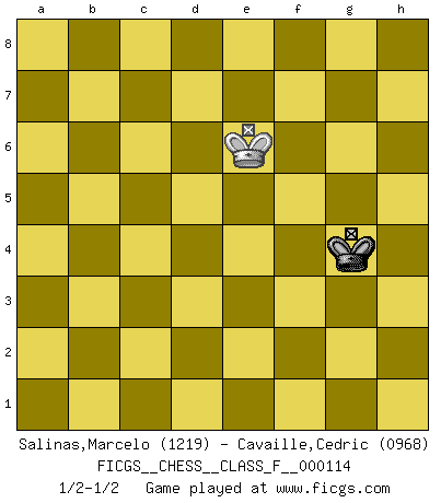 Last move : 1/2-1/2 2013 February 8 19:43:39 [Event "FICGS__CHESS__CLASS_F__000114"] [Site "FICGS"] [Date "2012.08.16"] [Round "1"] [White "Salinas,Marcelo"] [Black "Cavaille,Cedric"] [Result "1/2-1/2"] [WhiteElo "1219"] [BlackElo "0968"] 1.d4 g6 2.Nf3 Nf6 3.c3 d6 4.Bg5 Bg7 5.Bxf6 Bxf6 6.e3 Nd7 7.Bc4 e5 8.dxe5 Nxe5 9.Nxe5 dxe5 10.Qxd8+ Bxd8 11.O-O O-O 12.Nd2 a6 13.e4 b5 14.Bd5 Rb8 15.b4 Bg5 16.Nf3 Bf6 17.a3 Rd8 18.c4 Bb7 19.cxb5 axb5 20.Rac1 Bxd5 21.exd5 Rxd5 22.Rxc7 Rd3 23.Rc6 Kg7 24.Ra6 Rbd8 25.a4 bxa4 26.Rxa4 Rd1 27.b5 e4 28.Ne1 Bc3 29.Rxe4 Bxe1 30.Rfxe1 Rxe1+ 31.Rxe1 Rb8 32.Rb1 Rb6 33.Kf1 Kf6 34.Ke2 Ke5 35.Kd3 Kd5 36.Rb4 Kc5 37.Rd4 Rxb5 38.Rd7 Rb3+ 39.Ke4 f5+ 40.Ke5 Rb2 41.Rc7+ Kb4 42.Rxh7 Rxf2 43.Rh4+ Kc3 44.Rh3+ Kd2 45.g3 Ke3 46.Kf6 f4 47.gxf4 Kxf4 48.Kxg6 Kg4 49.Rh8 Rf3 50.h4 Rf5 51.Kg7 Rh5 52.Rxh5 Kxh5 53.Kf6 Kxh4 54.Ke6 Kg4 1/2-1/2 Modern defense Kingside Castling by player White (move 11) Kingside Castling by player Black (move 11) 10 pieces endgame at move 37 : White KRPPP , Black KRPPP WHITE : King + 1 Rook 3 Pawns BLACK : King + 1 Rook 3 Pawns 9 pieces endgame at move 42 : White KRPPP , Black KRPP WHITE : King + 1 Rook 3 Pawns BLACK : King + 1 Rook 2 Pawns 8 pieces endgame at move 42 : White KRPP , Black KRPP WHITE : King + 1 Rook 2 Pawns BLACK : King + 1 Rook 2 Pawns 7 pieces endgame at move 47 : White KRPP , Black KRP WHITE : King + 1 Rook 2 Pawns BLACK : King + 1 Rook 1 Pawn 6 pieces endgame at move 47 : White KRP , Black KRP WHITE : King + 1 Rook 1 Pawn BLACK : King + 1 Rook 1 Pawn 5 pieces endgame at move 48 : White KRP , Black KR WHITE : King + 1 Rook 1 Pawn BLACK : King + 1 Rook 4 pieces endgame at move 52 : White KRP , Black K WHITE : King + 1 Rook 1 Pawn BLACK : King + 3 pieces endgame at move 52 : White KP , Black K WHITE : King + 1 Pawn BLACK : King + 2 pieces endgame at move 53 : White K , Black K WHITE : King + BLACK : King + This chess game ended in a draw. Follow this game move after move (download)Chess is the gymnasium of the mind. (Blaise Pascal) Ich bin stolz ein Bulgare zu sein. (Veselin Topalov) Entre mas años cumplo, mas valoro los Peones. (Keres) Le système Elo représente seulement une moyenne. Il est simplement un indicateur de votre stabilité. (Anatoli Karpov) Faith : not wanting to know what is true. (Friedrich Nietzsche)