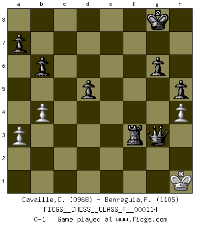 Last move : 0-1 2012 August 22 22:26:53 [Event "FICGS__CHESS__CLASS_F__000114"] [Site "FICGS"] [Date "2012.08.16"] [Round "1"] [White "Cavaille,Cedric"] [Black "Benreguia,Frederic"] [Result "0-1"] [WhiteElo "0968"] [BlackElo "1105"] 1.e4 e5 2.Nf3 d6 3.Bc4 Qe7 4.d4 g6 5.Ng5 Nh6 6.Qf3 b6 7.b4 Bg7 8.d5 c6 9.dxc6 Nxc6 10.a3 Bb7 11.O-O Nd4 12.Qd1 O-O 13.Nf3 Bxe4 14.Bd3 Nxf3+ 15.Kh1 Bxd3 16.Qxd3 e4 17.Qe3 Bxa1 18.gxf3 f5 19.Qb3+ Nf7 20.fxe4 Qxe4+ 21.f3 Qe7 22.Bb2 Bxb2 23.Qxb2 Qe2 24.Kg1 Ne5 25.Qc3 Rac8 26.Qb3+ Rf7 27.Rf2 Qd1+ 28.Rf1 Nxf3+ 29.Kf2 Rxc2+ 30.Kg3 Rg2+ 31.Kxg2 Qxb3 32.Rxf3 Qxb1 33.Kg3 h5 34.h4 Qe4 35.Rf4 Qe1+ 36.Rf2 f4+ 37.Kg2 d5 38.Rf1 Qg3+ 39.Kh1 f3 40.Rxf3 Rxf3 0-1 Philidor's defense Kingside Castling by player White (move 11) Kingside Castling by player Black (move 12) Player Black won this chess game. Follow this game move after move (download)Chess is war over the board. The object is to crush the opponents mind. (Bobby Fischer) Ein Remis kann durch Wiederholung von drei Zügen oder durch einen schlechte Zug erreicht werden. (Savielly Grigorievitsch Tartakower) Yo siempre he tenido un ligero sentimiento de lástima por una persona que no tiene conocimiento del Ajedrez. (Siegbert Tarrasch) Je crois qu'il existe des manières très spécifiques de jouer efficacement contre une machine. Evidemment, nous n'avons aucune chance en technique pure, parce que l'ordinateur calcule de manière parfaite. Mais lorsque nous faisons appel à notre cerveau, en utilisant l'intuition et la compréhension, alors nous restons beaucoup plus forts. (Anatoli Karpov) History is the quarrels of popes and kings, with wars or pestilences in every page; the men all so good for nothing, and hardly any women at all. (Jane Austen)