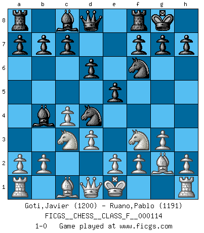 Last move : 1-0 2012 October 6 9:25:37 [Event "FICGS__CHESS__CLASS_F__000114"] [Site "FICGS"] [Date "2012.08.16"] [Round "1"] [White "Goti,Javier"] [Black "Ruano,Pablo"] [Result "1-0"] [WhiteElo "1200"] [BlackElo "1191"] 1.c4 Nf6 2.Nc3 e5 3.d3 Bb4 4.Qc2 d6 5.g3 Nc6 6.Nf3 O-O 7.Bg2 Nd4 8.Qd1 1-0 This chess game has been lost on time (started : 2012.08.16 13:49:9) English Opening Kingside Castling by player Black (move 6) Player White won this chess game. Follow this game move after move (download)Excellence at Chess is one mark of a scheming mind. (Sir Arthur Conan Doyle) Wenn Du nicht kämpfst, um anderen etwas zu beweisen, sondern nur für Dich selbst, dann bist du fast unbesiegbar. (Garry Kasparov) El Peón aislado arroja penumbra sobre todo el tablero. (Aaron Nimzovich) J'apprécie les joueurs d'est-indienne, c'est grâce à eux que je nourris ma famille depuis tant d'années. (Petrosian) A belief is an idea the mind possesses, an idea that possesses the mind. (Robert Oxden Bolton)