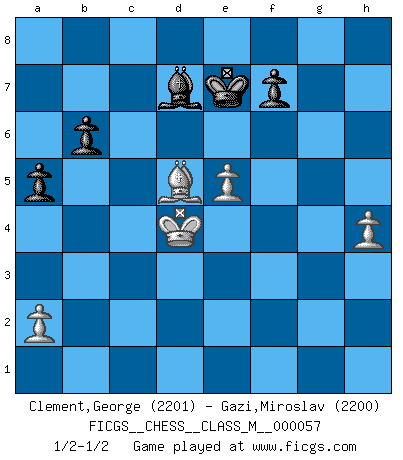 Last move : 1/2-1/2 2013 May 25 15:14:36 [Event "FICGS__CHESS__CLASS_M__000057"] [Site "FICGS"] [Date "2012.08.16"] [Round "1"] [White "Clement,George"] [Black "Gazi,Miroslav"] [Result "1/2-1/2"] [WhiteElo "2201"] [BlackElo "2200"] 1.Nf3 Nf6 2.d4 g6 3.c4 Bg7 4.Nc3 d5 5.cxd5 Nxd5 6.e4 Nxc3 7.bxc3 c5 8.Be3 Qa5 9.Qd2 Nc6 10.Rc1 cxd4 11.cxd4 Qxd2+ 12.Kxd2 O-O 13.d5 Rd8 14.Kc2 Ne5 15.Nxe5 Bxe5 16.f4 Bg7 17.Bc4 b6 18.Kb3 e6 19.Rhd1 exd5 20.Bxd5 Bg4 21.Rd2 Rac8 22.Rxc8 Rxc8 23.Bd4 Bxd4 24.Rxd4 Kf8 25.Bc4 Rc5 26.Rd5 Rxd5 27.Bxd5 h6 28.Kc4 Bd7 29.e5 Ke7 30.Kd4 g5 31.fxg5 hxg5 32.g3 a5 33.h4 gxh4 34.gxh4 1/2-1/2 Reti Opening Kingside Castling by player Black (move 12) 10 pieces endgame at move 34 : White KBPPP , Black KBPPP WHITE : King + 1 Bishop 3 Pawns BLACK : King + 1 Bishop 3 Pawns This chess game ended in a draw. Follow this game move after move (download)A man that will take back a move at Chess will pick a pocket. (Richard Fenton) Darum geht es im Schach. Einen Tag gibst du deinem Gegner eine Lektion, am nächsten Tag gibt er dir eine. (Robert James Fischer) El juego de Fischer siempre fue nítido, racional y brillante. Uno de los mejores por siempre. (Dave Regis) Il s'avisa de me proposer d'apprendre les échecs qu'il jouait un peu... me voilà forcené des échecs. J'achète un échiquier, je m'enferme dans ma chambre, j'y passe des jours et des nuits à vouloir apprendre par cur toutes les parties. (Jean-Jacques Rousseau, Confessions) Follow your passion, and success will follow you. (Arthur Buddhold)