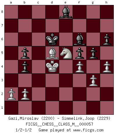 Last move : 1/2-1/2 2013 March 4 20:12:14 [Event "FICGS__CHESS__CLASS_M__000057"] [Site "FICGS"] [Date "2012.08.16"] [Round "1"] [White "Gazi,Miroslav"] [Black "Simmelink,Joop"] [Result "1/2-1/2"] [WhiteElo "2200"] [BlackElo "2229"] 1.d4 d5 2.c4 c6 3.Nc3 Nf6 4.e3 e6 5.Nf3 Nbd7 6.Qc2 Bd6 7.Bd3 O-O 8.O-O dxc4 9.Bxc4 a6 10.e4 e5 11.Rd1 Qc7 12.h3 b5 13.Bb3 exd4 14.Nxd4 Re8 15.Bg5 b4 16.Na4 Nxe4 17.Re1 Ndf6 18.Bxf6 Nxf6 19.Rxe8+ Nxe8 20.Re1 Nf6 21.Qxc6 Qxc6 22.Nxc6 Bd7 23.Rd1 Bf8 24.Ne5 Be8 25.Nb6 Rb8 26.Nd5 Nxd5 27.Rxd5 Rb5 28.Rxb5 axb5 29.Bd5 Bd6 30.Nd3 Kf8 31.Kf1 f6 32.Ke2 Ke7 33.f4 g6 34.Kf3 h6 35.h4 Kd8 36.Nf2 Be7 37.g3 f5 38.Nd3 Bf6 39.Ne5 Ke7 40.Ke3 Kd6 41.Kd4 g5 1/2-1/2 QGD Slav defense Kingside Castling by player Black (move 7) Kingside Castling by player White (move 8) This chess game ended in a draw. Follow this game move after move (download)A thorough understanding of the typical mating continuations makes the most complicated sacrificial combinations leading up to them not only not difficult, but almost a matter of course. (Siegbert Tarrasch) Ein Großmeister muß tausende Partien in seinem Kopf speichern, denn diese sind für Ihn, was die Worte der Muttersprache für gewöhnliche Leute sind, oder Noten für Musiker... (Garry Kasparov) Si el Ajedrez es una ciencia, es la mas inexacta. Si el Ajedrez es un arte, es demasiado inexacto para ser visto como tal. Si el Ajedrez es un deporte, es demasiado esotérico. Si el Ajedrez es un juego, es demasiado exigente para ser solo un juego. Si el Ajedrez es una aventura, es una muy demandante. Si el Ajedrez es una pasión, es una muy gratificante. Si el Ajedrez es la vida, es una muy triste. (Anónimo) Donnez-moi un Cavalier en 6e et je gagnerais toutes mes parties. (Steinitz) It is not true that people stop pursuing dreams because they grow old, they grow old because they stop pursuing dreams. (Gabriel Garcia Marquez)