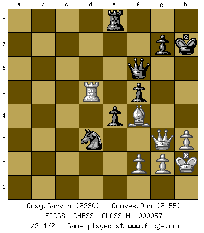 Last move : 1/2-1/2 2013 January 5 10:31:10 [Event "FICGS__CHESS__CLASS_M__000057"] [Site "FICGS"] [Date "2012.08.16"] [Round "1"] [White "Gray,Garvin"] [Black "Groves,Don"] [Result "1/2-1/2"] [WhiteElo "2230"] [BlackElo "2155"] 1.e4 e6 2.d4 d5 3.Nc3 Bb4 4.e5 c5 5.a3 Bxc3+ 6.bxc3 Ne7 7.a4 O-O 8.Ba3 b6 9.Nf3 Qc7 10.Bb5 Bd7 11.Bd3 h6 12.O-O Bxa4 13.Qd2 Nd7 14.Qf4 Qc6 15.dxc5 bxc5 16.c4 dxc4 17.Qxc4 Rab8 18.Qg4 Rfd8 19.Rfe1 Bb5 20.c4 Ba6 21.Bc1 Nf5 22.Qh5 Bb7 23.Bxf5 exf5 24.e6 fxe6 25.Bxh6 e5 26.Bg5 Rf8 27.Rxa7 Qb6 28.R7a1 Bxf3 29.Qxf3 e4 30.Qg3 Rbe8 31.Bf4 Qf6 32.Ra7 Ne5 33.h3 Rf7 34.Rea1 Rxa7 35.Rxa7 Kh7 36.Kh2 Nxc4 37.Rc7 Ne5 38.Rxc5 Nd3 39.Rd5 1/2-1/2 French : Winawer, Advance, Smyslov variation Kingside Castling by player Black (move 7) Kingside Castling by player White (move 12) This chess game ended in a draw. Follow this game move after move (download)You sit at the board and suddenly your heart leaps. Your hand trembles to pick up the piece and move it. But what Chess teaches you is that you must sit there calmly and think about whether it's really a good idea and whether there are other better ideas. (Stanley Kubrick) Schach ist Krieg, im Schach geht es um testosterongesteuerte Urschreie. (Garry Kasparov) La vida es como un juego de Ajedrez, cambiando con cada movimiento. (Proverbio Chino) Je ne suis pas le dernier à jouer lâchement des coups douteux pendant le zeïtnot de l'adversaire pour l'achever: en effet les coups qui font le plus peur sont ceux que l'on ne comprend pas. Je me fais souvent peur quand je joue. (Un professeur anonyme) Life is painting a picture, not doing a sum. (Oliver Wendell Holmes, Jr.)