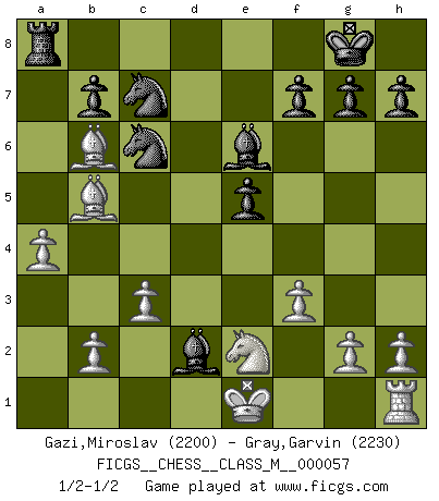 Last move : 1/2-1/2 2013 March 16 10:15:35 [Event "FICGS__CHESS__CLASS_M__000057"] [Site "FICGS"] [Date "2012.08.16"] [Round "1"] [White "Gazi,Miroslav"] [Black "Gray,Garvin"] [Result "1/2-1/2"] [WhiteElo "2200"] [BlackElo "2230"] 1.d4 Nf6 2.Bg5 Ne4 3.Bf4 c5 4.f3 Qa5+ 5.c3 Nf6 6.Nd2 cxd4 7.Nb3 Qb6 8.Qxd4 Nc6 9.Qxb6 axb6 10.a4 d5 11.Bc7 e5 12.Bxb6 Be7 13.Bf2 Be6 14.Nd2 d4 15.e4 dxe3 16.Bxe3 O-O 17.Bb5 Nd5 18.Bf2 Rfd8 19.Ne2 Bg5 20.Rd1 Nc7 21.Bb6 Rxd2 22.Rxd2 Bxd2+ 1/2-1/2 Trompowsky attack (Ruth, Opovcensky Opening) Kingside Castling by player Black (move 16) This chess game ended in a draw. Follow this game move after move (download)When you don't know what to do, wait for your opponent to get an idea - it's sure to be wrong. (Tarrasch) Wenn ich mich einlogge, glauben die Leute gewöhnlich nicht, dass ich es selbst bin und sie fangen an, mir dumme Fragen zu stellen. Und wenn sie es glauben, stellen sie wieder andere dumme Fragen. (Judith Polgar) El Ajedrez es una guerra en un tablero. El objetivo es aplastar la mente del oponente. (Bobby Fischer) Shah mat. Le roi est mort. Cri de fierté d'un joueur venant de terrasser son adversaire, courtoisement, sans effusion de sang. There will be no order, only chaos. (Sol Robeson in Pi by Darren Aronofsky)