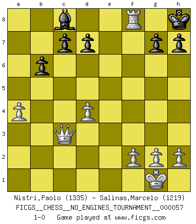 Last move : 1-0 2013 January 2 8:47:43 [Event "FICGS__CHESS__NO_ENGINES_TOURNAMENT__000057"] [Site "FICGS"] [Date "2012.08.19"] [Round "1"] [White "Nistri,Paolo"] [Black "Salinas,Marcelo"] [Result "1-0"] [WhiteElo "1335"] [BlackElo "1219"] 1.d4 f5 2.Nf3 e6 3.e3 Nf6 4.Bd3 Bb4+ 5.c3 Ba5 6.O-O Nc6 7.Nbd2 O-O 8.b4 Bb6 9.a4 a5 10.Bb2 axb4 11.cxb4 Nxb4 12.Bxf5 exf5 13.Qb3+ Nbd5 14.e4 fxe4 15.Nxe4 Ra5 16.Nxf6+ Qxf6 17.Bc3 Qc6 18.Bxa5 Bxa5 19.Rac1 Qd6 20.Rfd1 Kh8 21.Rc5 Rxf3 22.Qxf3 Nc3 23.Rxc3 Bxc3 24.Qxc3 b6 25.Re1 Qa3 26.Re8+ Qf8 27.Rxf8+ 1-0 Dutch Kingside Castling by player White (move 6) Kingside Castling by player Black (move 7) Player White won this chess game. Follow this game move after move (download)I don't believe in psychology. I believe in good moves. (Bobby Fischer) Ein Kibitz ist einer, der deinem Gegner gute Ratschläge gibt. (Andrew Soltis) No es una movida, aún la mejor movida que tu debas buscar, sino un plan comprensible. (Eugene Znosko-Borovsky) Donnez-moi un Cavalier en 6e et je gagnerais toutes mes parties. (Steinitz) Luck never gives; it only lends. (Swedish proverb)