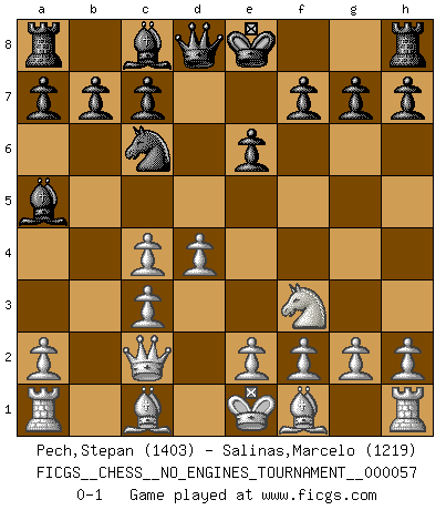 Last move : 0-1 2012 November 2 10:4:40 [Event "FICGS__CHESS__NO_ENGINES_TOURNAMENT__000057"] [Site "FICGS"] [Date "2012.08.19"] [Round "1"] [White "Pech,Stepan"] [Black "Salinas,Marcelo"] [Result "0-1"] [WhiteElo "1403"] [BlackElo "1219"] 1.d4 Nf6 2.c4 d5 3.Nf3 Nc6 4.Nc3 Ne4 5.Nxd5 e6 6.Nc3 Bb4 7.Qc2 Nxc3 8.bxc3 Ba5 0-1 This chess game has been lost on time (started : 2012.08.19 8:2:17) Queen's pawn game Player Black won this chess game. Follow this game move after move (download)White lost because he failed to remember the right continuation and had to think up the moves himself. (Siegbert Tarrasch) Sitze auf Deine Hände. (Siegbert Tarrasch) No hay precio que no valga la pena por la cabellera del Rey enemigo. (Koblentz) Les échecs sont un jeu terrible. Si vous n'avez pas le centre, votre adversaire a une position plus libre. Par contre, si vous avez le centre, alors vous avez vraiment quelque chose pour laquelle vous inquiéter ! (Siegbert Tarrasch) Wisdom doesn't necessarily come with age. Sometimes age just shows up all by itself. (Tom Wilson)