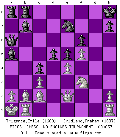 Last move : 0-1 2012 October 9 21:0:38 [Event "FICGS__CHESS__NO_ENGINES_TOURNAMENT__000057"] [Site "FICGS"] [Date "2012.08.19"] [Round "1"] [White "Trigance,Emile"] [Black "Cridland,Graham"] [Result "0-1"] [WhiteElo "1600"] [BlackElo "1637"] 1.b4 e5 2.Bb2 f6 3.e4 Bxb4 4.Bc4 Ne7 5.f4 Nbc6 6.f5 Na5 7.Bb5 O-O 8.c3 Bd6 9.Na3 c6 10.Be2 Bc7 11.Nc4 Nxc4 12.Bxc4+ d5 13.Bb3 Kh8 14.d3 a5 15.Nf3 a4 16.Bxa4 b5 17.Bb3 Bb6 18.Qe2 Bb7 19.g4 c5 20.O-O-O Qc7 21.Kb1 c4 22.dxc4 bxc4 23.Bc2 Rfb8 24.g5 Ba5 25.gxf6 gxf6 26.Ka1 Qb6 27.Rb1 Qa6 0-1 Polish (Sokolsky) opening Kingside Castling by player Black (move 7) Queenside Castling by player White (move 20) Player Black won this chess game. Follow this game move after move (download)Dazzling combinations are for the many, shifting wood is for the few. (Georg Kieninger) Im Blitz ist es einfacher mit einer Figur weniger anzugreifen, als sich mit einer Mehrfigur zu verteidigen. (Mikhail Nekhemyevich Tal) Aquel que ve no otra dirección en el juego que la de dar Jaque Mate a su oponente, nunca será un buen jugador de Ajedrez. (Euwe) C'est une question de caractère, Beaucoup de gens perdent leur motivation très vite. D'autres, ils sont rares, peuvent la conserver très longtemps. J'aime les échecs, encore aujourd'hui je suis heureux d'analyser des parties. J'aime toujours gagner, je déteste encore perdre. Bien jouer est important pour mon intégrité intellectuelle et morale. Et puis les échecs vivent en ce moment une période historique grâce à Internet. Ils se développent dans les systèmes éducatifs à travers le monde. Ils sortent de leur ghetto, et c'est mon rôle de mener à bien cette révolution. (Gary Kasparov) There's no money in correspondence chess. (John Knudsen)