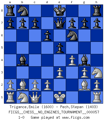 Last move : 1-0 2012 October 2 21:13:23 [Event "FICGS__CHESS__NO_ENGINES_TOURNAMENT__000057"] [Site "FICGS"] [Date "2012.08.19"] [Round "1"] [White "Trigance,Emile"] [Black "Pech,Stepan"] [Result "1-0"] [WhiteElo "1600"] [BlackElo "1403"] 1.b4 e5 2.Bb2 Bxb4 3.f4 d6 4.e3 Qh4+ 5.g3 Qe7 6.Nh3 Nf6 7.Bg2 Bg4 8.Qc1 1-0 This chess game has been lost on time (started : 2012.08.19 8:2:17) Polish (Sokolsky) opening Player White won this chess game. Follow this game move after move (download)Chess mastery essentially consists of analyzing Chess positions accurately. (Mikhail Botvinnik) Ich habe die besten Aussichten, den ersten Preis zu gewinnen - denn jeder muss gegen Steinitz spielen, nur ich nicht! (Wilhelm Steinitz) Aquel que toma al Peón de Caballo de la Reina, se pasará la noche a dormir en la calle. (Anónimo) Tous ces prétendus hommes politiques sont les pions, les Cavaliers, les Tours ou les Fous d'une partie d'échecs qui se jouera tant qu'un hasard ne renversera pas l'échiquier. (Honoré de Balzac) Fortune favours the audacious. (Desiderius Erasmus)