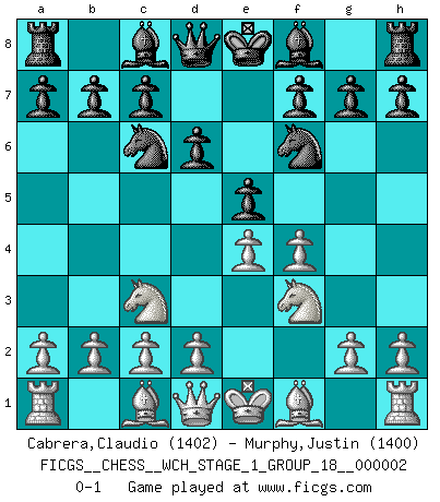 Last move : 0-1 2007 February 21 23:24:28 [Event "FICGS__CHESS__WCH_STAGE_1_GROUP_18__000002"] [Site "FICGS"] [Date "2007.01.16"] [Round "1"] [White "Cabrera,Claudio"] [Black "Murphy,Justin"] [Result "0-1"] [WhiteElo "1402"] [BlackElo "1400"] 1.e4 e5 2.Nc3 Nf6 3.f4 Nc6 4.Nf3 d6 0-1 This chess game has been lost on time (started : 2007.01.16 15:29:18) Vienna : Falkbeer variation Player Black won this chess game. Follow this game move after move (download)Chess is the gymnasium of the mind. (Blaise Pascal) Obwohl ich vom Stil her kaum zu den Priestern der Schachkunst gezählt werde, halte ich Schach doch für eine Kunst. (Tigran Petrosjan) Aquellos que dicen que entienden al Ajedrez, no entienden nada. (Robert Hubner) La solitude du joueur d'Echecs à l'approche du mat est semblable à celle du condamné. (Francis Szpiner) All men can see these tactics whereby I conquer, but what none can see is the strategy out of which victory is evolved. (Sun Tzu)