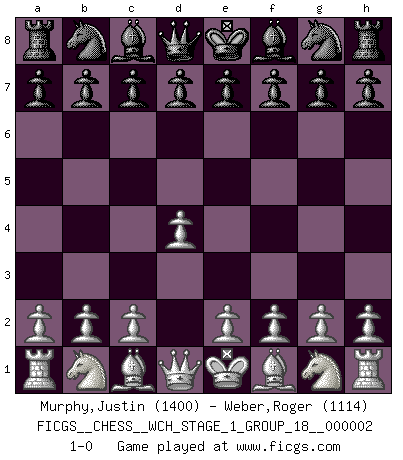 Last move : 1-0 2007 February 16 4:31:1 [Event "FICGS__CHESS__WCH_STAGE_1_GROUP_18__000002"] [Site "FICGS"] [Date "2007.01.16"] [Round "1"] [White "Murphy,Justin"] [Black "Weber,Roger"] [Result "1-0"] [WhiteElo "1400"] [BlackElo "1114"] 1.d4 1-0 This chess game has been lost on time (started : 2007.01.16 15:29:18) Queen's pawn Player White won this chess game. Follow this game move after move (download)Every Pawn is a potential Queen. (James Mason) Schach ist Kampf, hauptsächlich jedoch gegen die eigenen Fehler. (Savielly Grigorievitsch Tartakower) Todos los jugadores de Ajedrez deberían tener un pasatiempo. (Savielly Tartakower) C'est la seule position que je connaisse où les deux camps sont mals. Propos prêtés à V. Anand. CHESS, n. f. [echecs, Fr.] A nice and abstruse game, in which two sets of puppets are moved in opposition to each other. (Dr Samuel Johnson, A Dictionary Of The English Language, 1755)