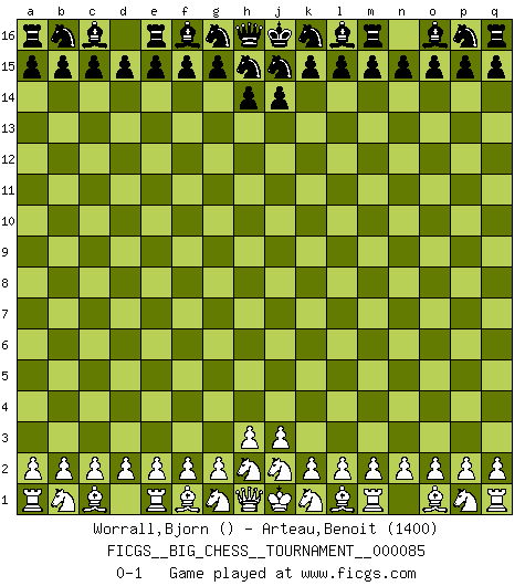 Last move : 0-1 2012 September 22 7:54:45 [Event "FICGS__BIG_CHESS__TOURNAMENT__000085"] [Site "FICGS"] [Date "2012.08.23"] [Round "1"] [White "Worrall,Bjorn"] [Black "Arteau,Benoit"] [Result "0-1"] [WhiteElo ""] [BlackElo "1400"] 0-1 This big chess game has been lost on time (started : 2012.08.23 2:33:36) Follow this game move after move (download)It is no time to be playing Chess when the house is on fire. (Italian Proverb) Charakterschwächen offenbaren sich normalerweise während einer Schachpartie. (Garry Kasparov) Cuando tu casa esta en llamas, no puedes ser molestado por tus vecinos. O, como decinos en Ajedrez, si tu Rey esta bajo ataque, no te preocupa perder un Peón del lado de la Reina. (Gary Kasparov) Ce qui caractérise les parties de combat, c'est que si le défenseur a constamment de difficiles problèmes à résoudre, l'attaquant doit chercher sans relâche de nouvelles possibilités d'attaque. (Koblentz) Employ the attack like tactic of defense. (Chinese proverb)