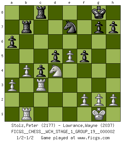 Last move : 1/2-1/2 2007 April 29 6:31:55 [Event "FICGS__CHESS__WCH_STAGE_1_GROUP_19__000002"] [Site "FICGS"] [Date "2007.01.16"] [Round "1"] [White "Stolz,Peter"] [Black "Lowrance,Wayne"] [Result "1/2-1/2"] [WhiteElo "2177"] [BlackElo "2037"] 1.e4 e5 2.Nf3 Nc6 3.d4 exd4 4.Nxd4 Bc5 5.Be3 Qf6 6.c3 Nge7 7.Bc4 O-O 8.O-O b6 9.Nxc6 Qxc6 10.Bxc5 Qxc5 11.Na3 d6 12.Qd4 Bd7 13.Qxc5 bxc5 14.b4 cxb4 15.cxb4 a6 16.Nc2 Bb5 17.Ne3 Bxc4 18.Nxc4 f5 19.e5 Rfb8 20.Rab1 d5 21.Na5 Rb5 22.Rfc1 Rc8 23.a3 c5 24.Nb3 c4 25.Nd4 Rb7 26.Rc3 1/2-1/2 Scotch game Kingside Castling by player Black (move 7) Kingside Castling by player White (move 8) This chess game ended in a draw. Follow this game move after move (download)A big shock; the best chess player in history has passed away. (Lajos Portisch, about Bobby Fischer's death) Ich bin es gewohnt, das die Jugend mir überhaupt keinen Respekt entgegenbringt. (Alexander Morozewich) ¡Examina movidas que hagan daño! Un buen ojo for movidas desvastantes es mucho mas importante que el conocimiento de principios estratégicos. (Purdy) La tactique, c'est ce que vous faites quand il y a quelque chose à faire; la stratégie, c'est ce que vous faites quand il n'y a rien à faire. (Savielli Tartacower) Life is like a game of cards: the hand you are dealt represents determinism; the way you play it is free will. (Jawaharlal Nehru)