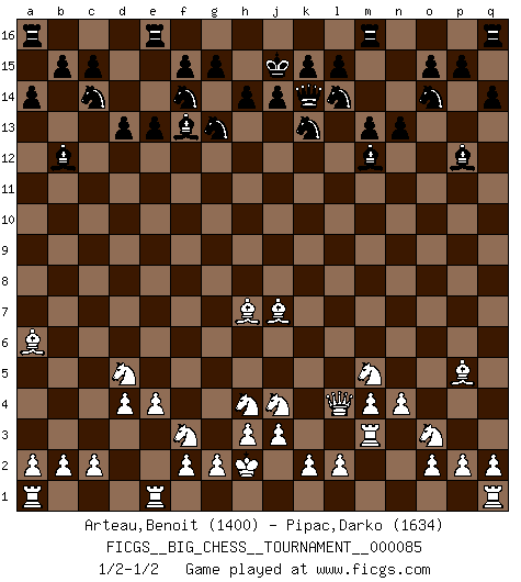 Last move : 1/2-1/2 2012 September 8 21:34:2 [Event "FICGS__BIG_CHESS__TOURNAMENT__000085"] [Site "FICGS"] [Date "2012.08.23"] [Round "1"] [White "Arteau,Benoit"] [Black "Pipac,Darko"] [Result "1/2-1/2"] [WhiteElo "1400"] [BlackElo "1634"] 1.j2-h4 p16-o14 2.h2-j4 j15-k13 3.d2-d4 h15-g13 4.n2-n4 b16-c14 5.g1-f3 d15-d13 6.k1-l3 g16-f14 7.e2-e4 n15-n13 8.m2-m4 k16-l14 9.f1-a6 m15-m13 10.l1-p5 e15-e13 11.b1-c3 c16-f13 12.p1-o3 o16-l13 13.c1-p13 q15-q14 14.p13-j7 a15-a14 15.o1-h7 h16-k14 16.c3-d5 j16-j15 17.h1-l4 l16-p12 18.j1-h2 f16-b12 19.l3-m5 l13-m12 20.m1-m3 1/2-1/2 Follow this game move after move (download)I play correspondence chess because it is both art and science while chess is art only. (A player at FICGS) Rauchen ist dem Schachspieler bei seiner Arbeit, also im Wettkampf, untersagt. (Viktor Kortschnoi) No todos los artistas son jugadores de Ajedrez, pero todos los jugadores de Ajedrez son artistas. (Marcel Duchamp) Si rien de grave n'est détecté lors de l'analyse d'une position, on joue alors le coup. Seconde règle de Blumenfeld. We cannot be sure of having something to live for unless we are willing to die for it. (Ernesto Che Guevara)
