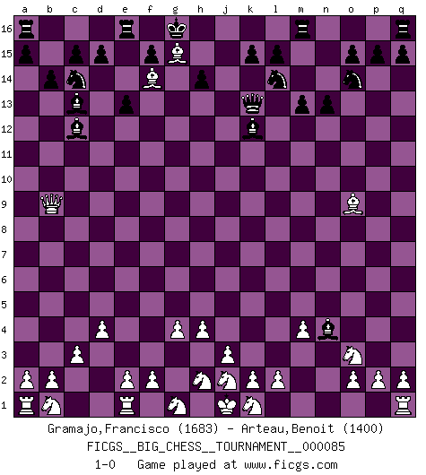 Last move : 1-0 2012 October 1 14:55:0 [Event "FICGS__BIG_CHESS__TOURNAMENT__000085"] [Site "FICGS"] [Date "2012.08.23"] [Round "1"] [White "Gramajo,Francisco"] [Black "Arteau,Benoit"] [Result "1-0"] [WhiteElo "1683"] [BlackElo "1400"] 1.d2-d4 j15-k13 2.n2-n4 h15-g13 3.o1-f9 e15-e13 4.f9-k13 j14-k13 5.m2-m4 k16-l14 6.l1-p5 g16-f14 7.g2-g4 n15-n13 8.c1-l9 p16-o14 9.h1-d5 m15-m13 10.p1-o3 l16-o13 11.m1-m3 f16-c13 12.m3-k3 o16-g9 13.k3-k13 h16-h15 14.d5-k5 b15-b14 15.k5-k7 g9-k12 16.l9-g13 h15-k13 17.g13-f14 b16-c14 18.f14-g15 j16-h15 19.p5-f14 c16-a14 20.k7-m9 a14-c12 21.m9-b9 h15-g16 22.h3-h4 o13-j8 23.c2-c3 j8-n4 24.f1-o9 1-0 Follow this game move after move (download)Morphy was probably the greatest genius of them all. (Bobby Fischer) Das Schachspiel übertrifft alle anderen Spiele so weit wie der Chimborasso einen Misthaufen. (Arthur Schopenhauer) En un gambito tu regalas un Peón por el bién de tomar un juego perdido. (Samuel Standige Boden) La vérité est comme le meilleur coup aux échecs : elle existe, mais il faut la chercher. (Arturo Perez-Reverte) The weakness of an artist is dogma. (Josh Waitzkin)