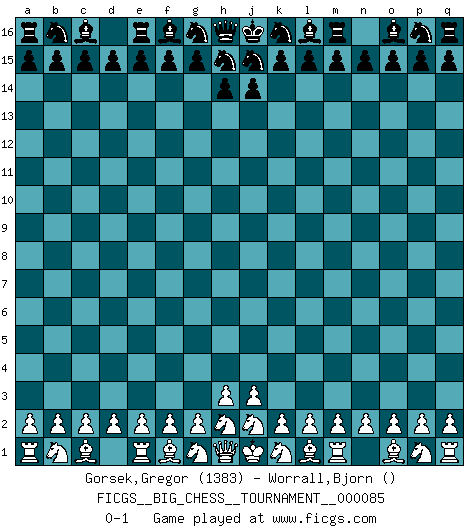 Last move : 0-1 2012 September 22 7:54:45 [Event "FICGS__BIG_CHESS__TOURNAMENT__000085"] [Site "FICGS"] [Date "2012.08.23"] [Round "1"] [White "Gorsek,Gregor"] [Black "Worrall,Bjorn"] [Result "0-1"] [WhiteElo "1383"] [BlackElo ""] 0-1 This big chess game has been lost on time (started : 2012.08.23 2:33:36) Follow this game move after move (download)Pawns are born free, yet they are everywhere in chains. (Rick Kennedy) Vom Schach wurde gesagt das Leben sei dafür nicht lange genug. Aber das ist der Fehler des Lebens, nicht des Schach'. (Irving Chernev) Una buena ofensiva y una buena defensa, comienzan ambas con un buen desarrollo. (Bruce A. Moon) Nous sommes les pions de la mystérieuse partie d'Echecs jouée par Dieu. Il nous déplace, nous arrête, nous pousse encore, puis nous lance un à un dans la boîte du Néant. Epitaphe sur la tombe de David Janowsky (1868-1927). The question of whether computers can think is just like question of whether submarines can swim. (Edsger W. Dijkstra)