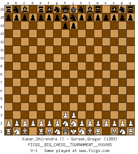 Last move : 0-1 2012 August 31 12:46:3 [Event "FICGS__BIG_CHESS__TOURNAMENT__000085"] [Site "FICGS"] [Date "2012.08.23"] [Round "1"] [White "Kumar,Dhirendra"] [Black "Gorsek,Gregor"] [Result "0-1"] [WhiteElo ""] [BlackElo "1383"] 0-1 Follow this game move after move (download)The chessboard is the world, the pieces are the phenomena of the Universe, the rules of the game are what we call the laws of Nature and the player on the other side is hidden from us. (Thomas Huxley) Sehr viele beherrschen heutzutage das große Einmalseins des Schachspiels und kennen sogar dessen Logarithmentafeln auswendig - deshalb sollte man hin und wieder zu beweisen trachten, dass zwei mal zwei auch fünf sein kann. (Mikhail Nekhemyevich Tal) El sobresalir en el Ajedrez es un signo de una mente intrigante. (Sir Arthur Conan Doyle) On a dit que l'homme se distingue de l'animal par le fait qu'il achète plus de livres qu'il ne peut en lire. Je voudrais suggérer qu'inclure à la liste des livres quelques livres d'échecs rendrait la distinction manifeste. (Edward Lasker) It's only after you lost everything, Tyler says, that you're free to do anything. (Chuck Palahniuk, Fight Club)