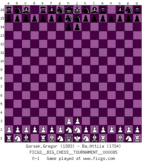 Last move : 0-1 2012 September 22 7:54:45 [Event "FICGS__BIG_CHESS__TOURNAMENT__000085"] [Site "FICGS"] [Date "2012.08.23"] [Round "1"] [White "Gorsek,Gregor"] [Black "Ba,Attila"] [Result "0-1"] [WhiteElo "1383"] [BlackElo "1734"] 0-1 This big chess game has been lost on time (started : 2012.08.23 2:33:36) Follow this game move after move (download)Bobby is the finest Chess player this country ever produced. His memory for the moves, his brilliance in dreaming up combinations, and his fierce determination to win are uncanny. (John Collins) Nur ein wirklich starker Spieler weiß wie schwach er spielt. (Savielly Grigorievitsch Tartakower) Los Peones son el alma de una partida de Ajedrez. (Francois Andre Danican Philidor) Les Echecs mettent en conflit, non pas deux intelligences, mais deux volontés. (Lasker) There are lots of people who mistake their imagination for their memory. (Josh Bilings)