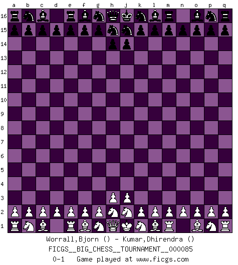 Last move : 0-1 2012 September 22 7:54:45 [Event "FICGS__BIG_CHESS__TOURNAMENT__000085"] [Site "FICGS"] [Date "2012.08.23"] [Round "1"] [White "Worrall,Bjorn"] [Black "Kumar,Dhirendra"] [Result "0-1"] [WhiteElo ""] [BlackElo ""] 0-1 This big chess game has been lost on time (started : 2012.08.23 2:33:36) Follow this game move after move (download)Blessed be the memory of him who gave the world this immortal game. (A. G. Gardiner) Es ist nicht das erste mal, dass sich die FIDE dem Arabischen Geld gebeugt hat (über die FIDE WM 2004 in Lybien). (Larry Evans) A través de las casillas del tablero, los Indios explican el movimiento del tiempo y la edad, las influencias mas altas que controlan el mundo y los lazos que vinculan al Ajedrez con el alma humana. (Al-Masudi) Mon pion favori sur ma case favorite ! Bronstein en parlant d'un coup de pion en h5 quand il avait les Noirs. I'm extremely disappointed. I send you out for exciting, new designer drugs, you come back with tomato sauce. (Gregory House, House M.D.)